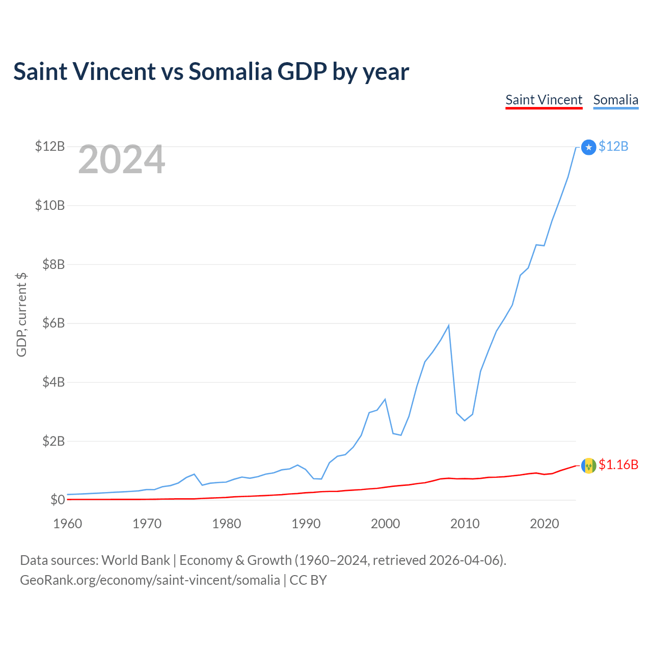 Saint Vincent has a GDP of $1.16B compared to $12B for Somalia, ranking 186/197 and 150/197 by economy size, respectively.