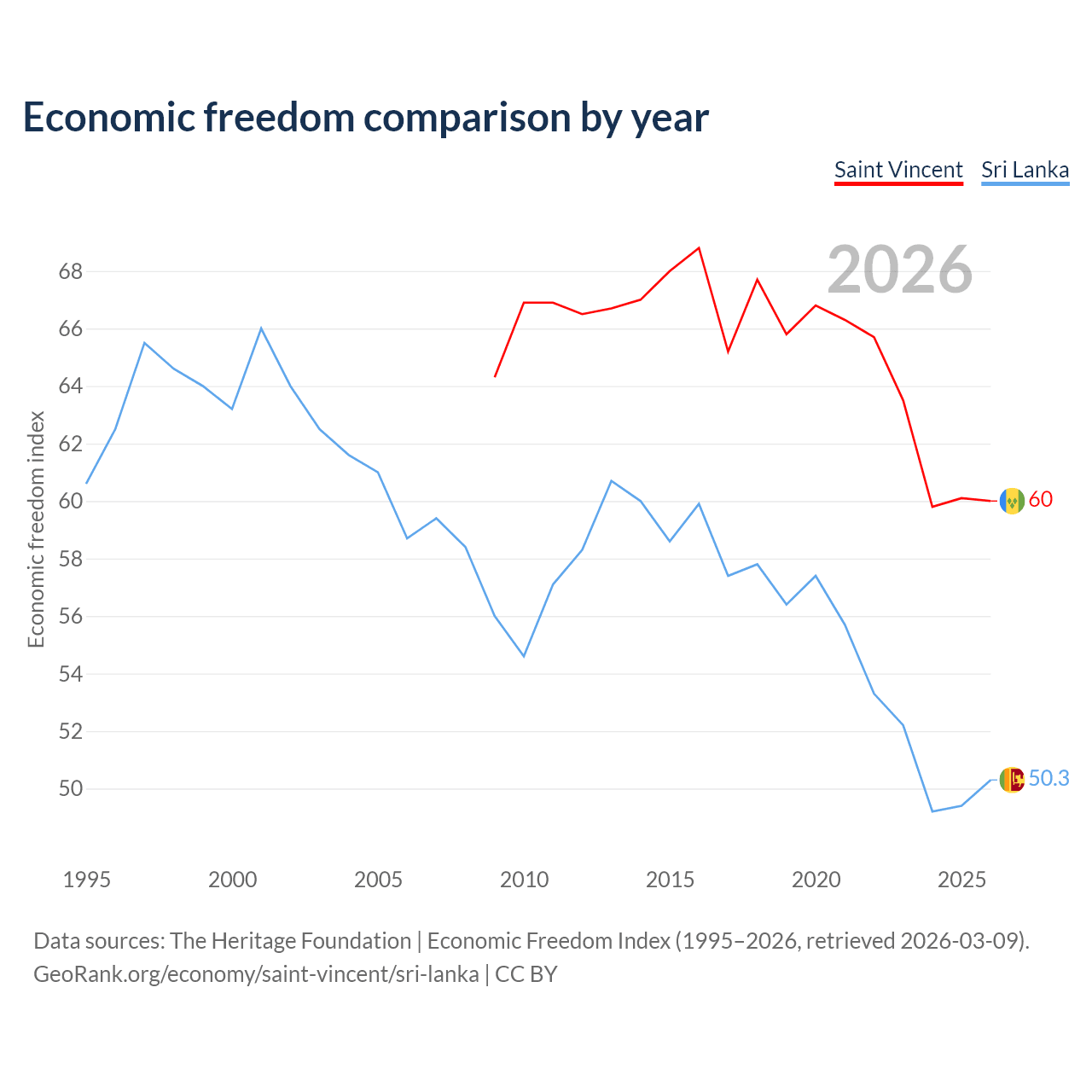 The Economic Freedom Index for Saint Vincent is 60, ranking 98/197, compared to 50.3 for Sri Lanka, ranking 162/197. The chart above displays a comparison of annual changes in economic freedom indexes.