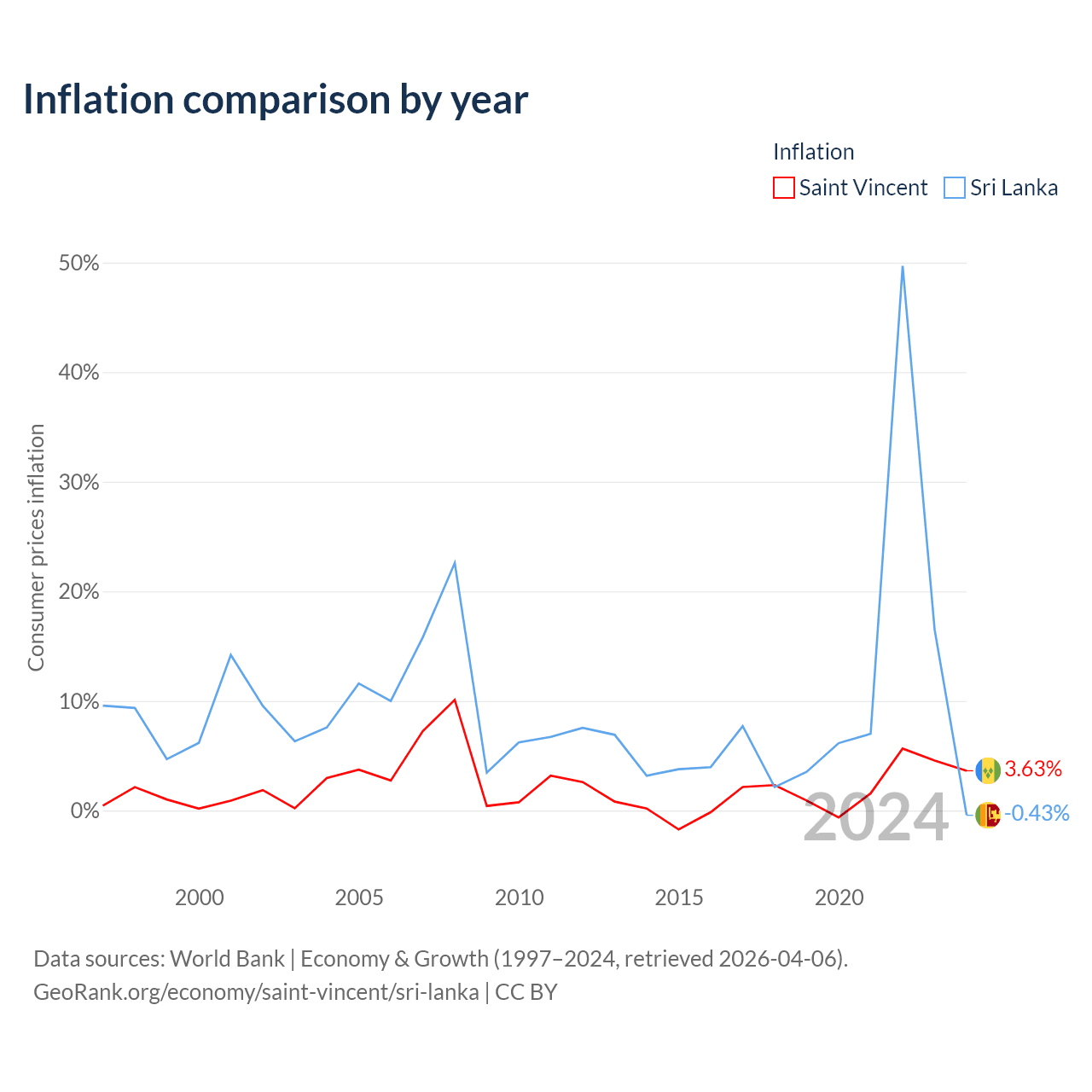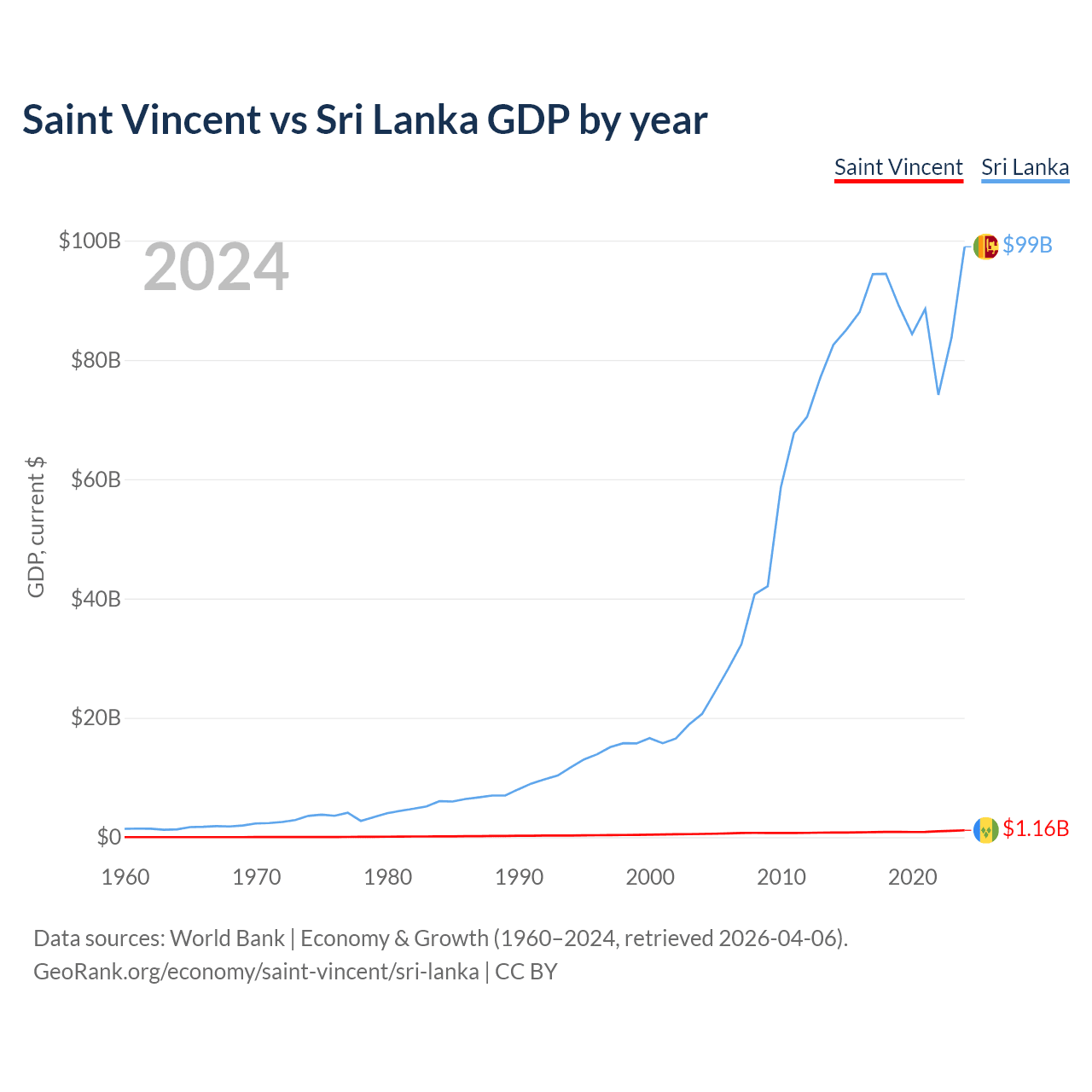 Saint Vincent has a GDP of $1.16B compared to $99B for Sri Lanka, ranking 186/197 and 72/197 by economy size, respectively.