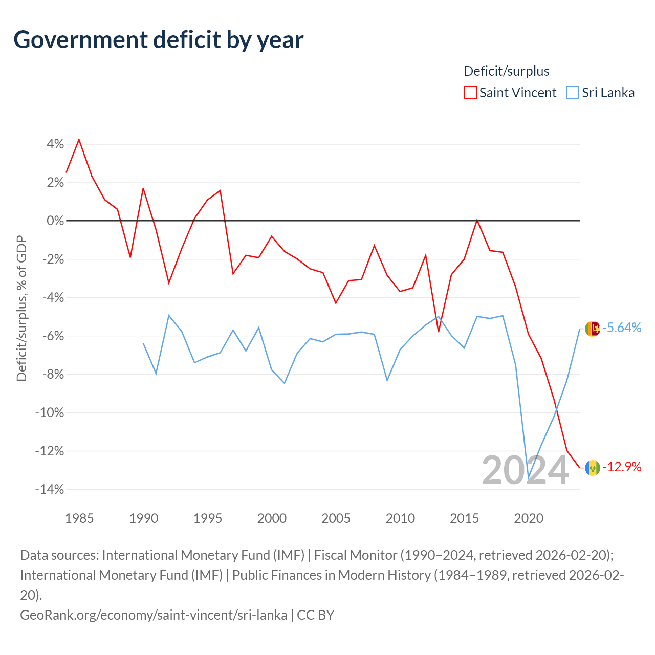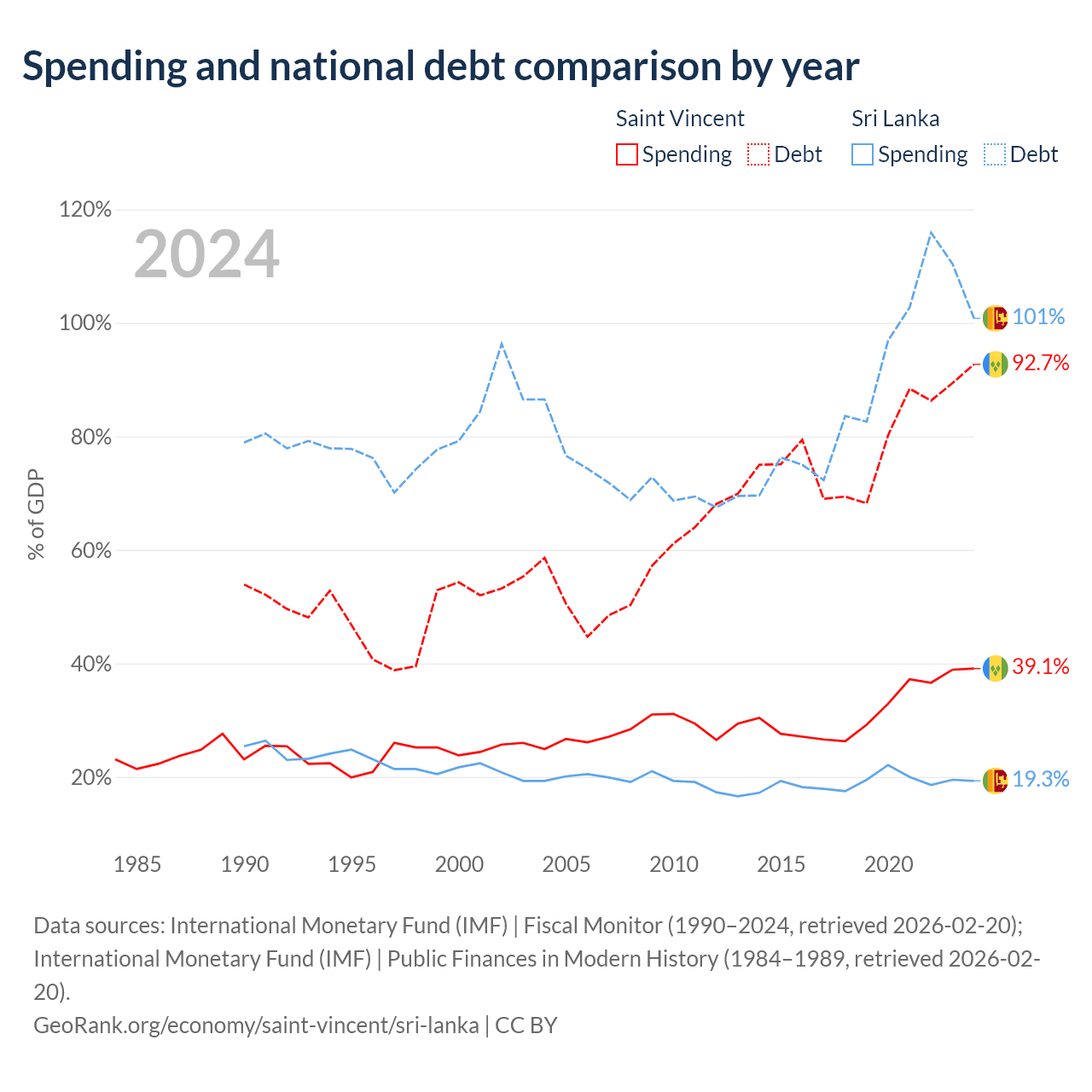 Saint Vincent has $1.07B in government debt (92.7% of GDP), compared to $99.8B (100.8% of GDP) in Sri Lanka.