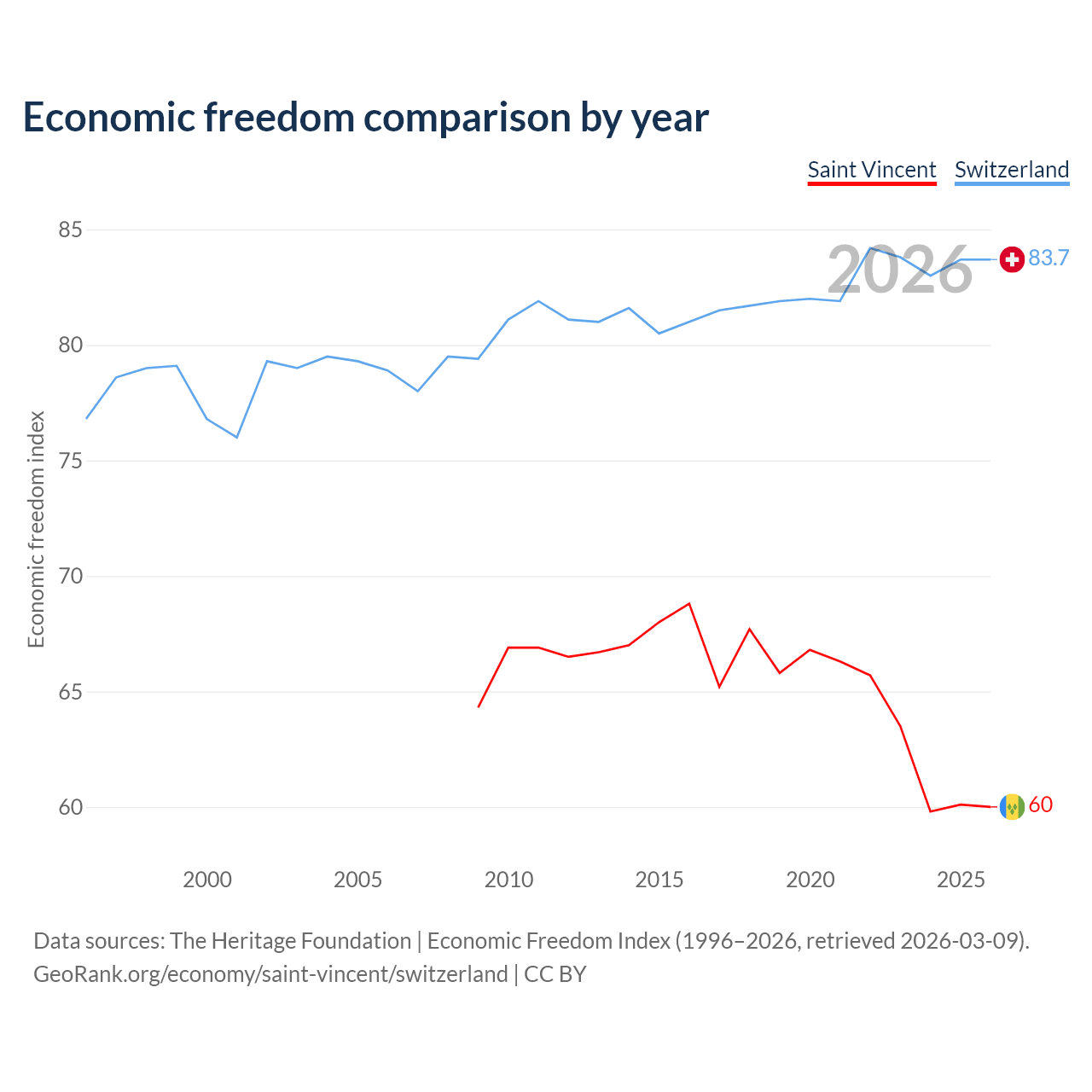 The Economic Freedom Index for Saint Vincent is 60, ranking 98/197, compared to 83.7 for Switzerland, ranking 2/197. The chart above displays a comparison of annual changes in economic freedom indexes.