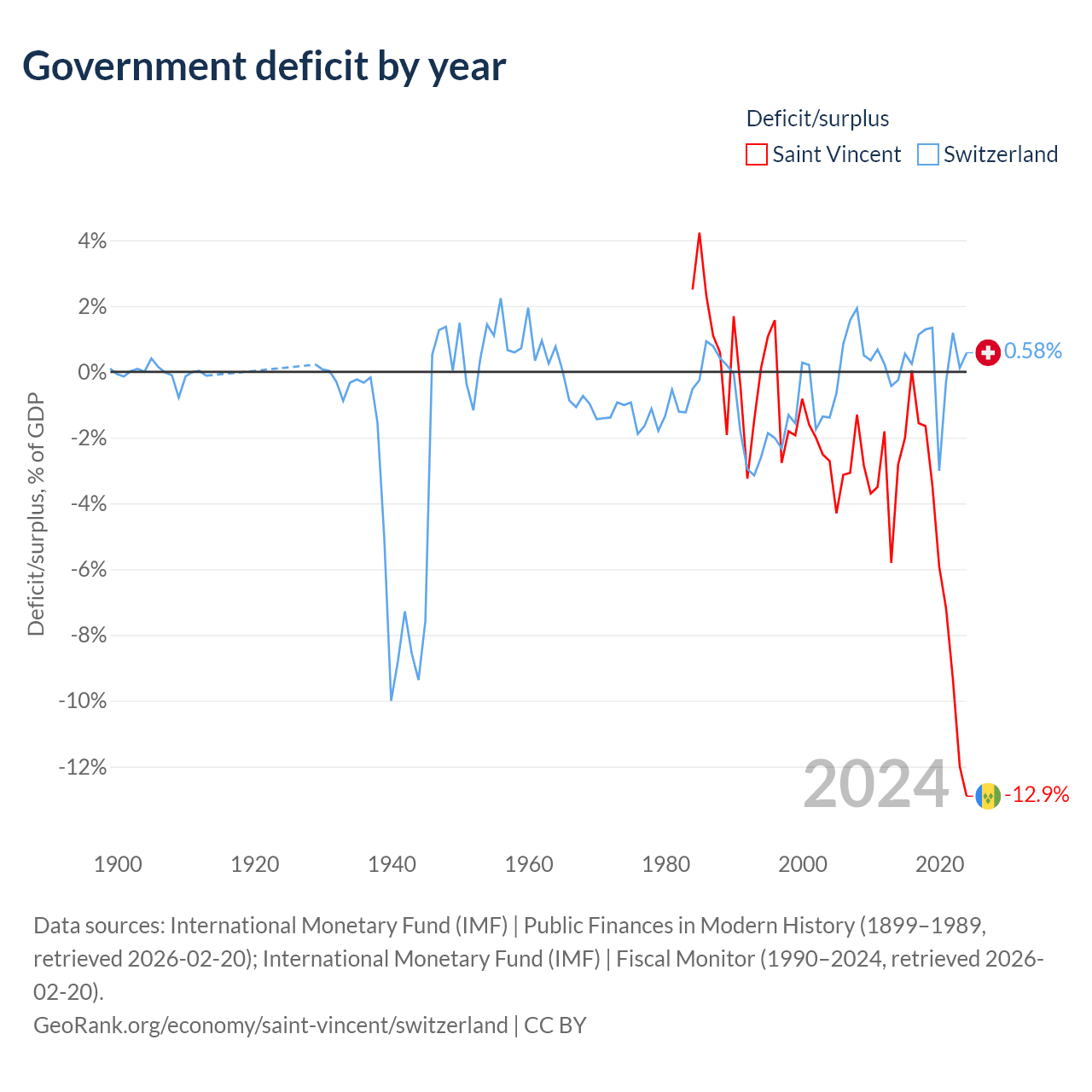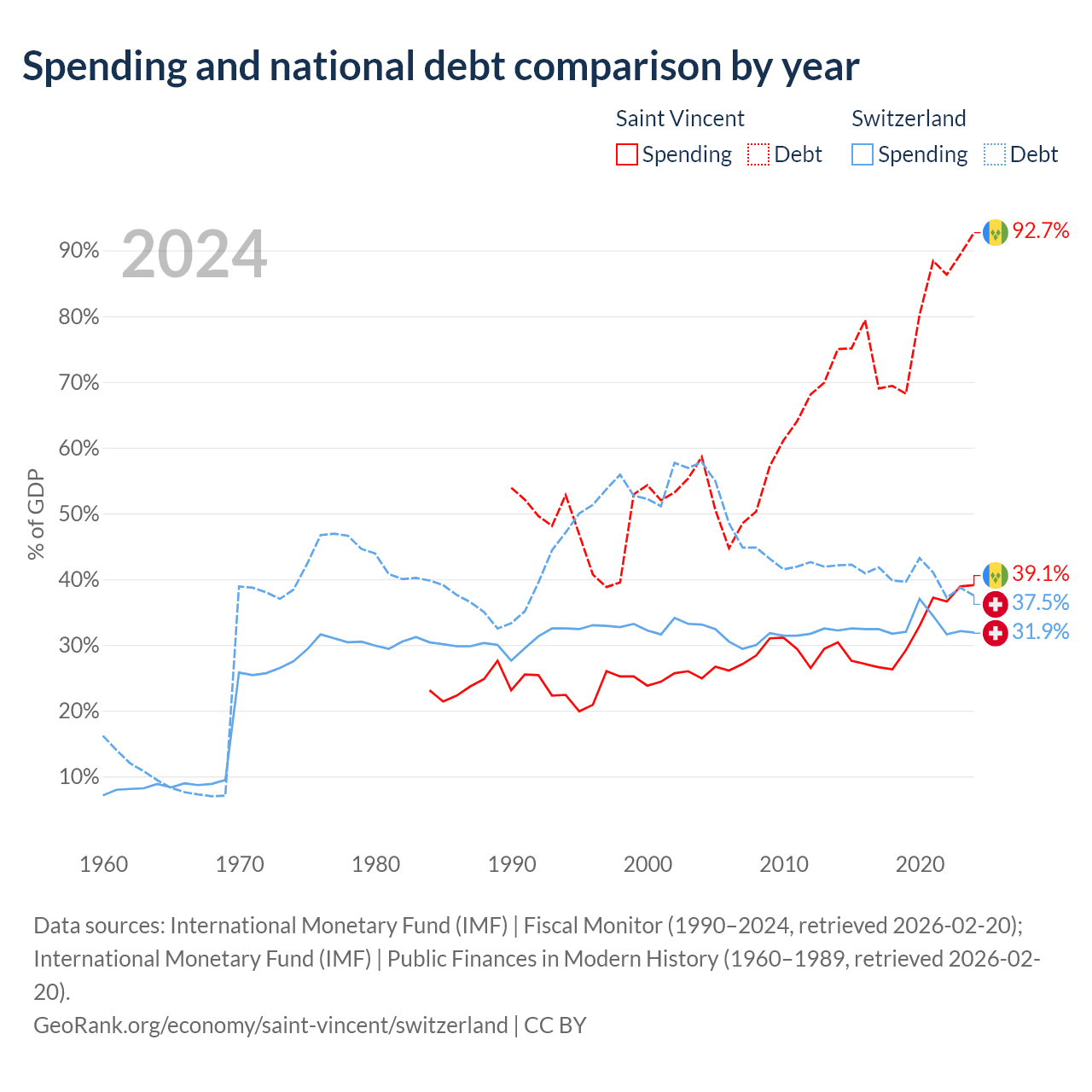 Saint Vincent has $1.07B in government debt (92.7% of GDP), compared to $351B (37.5% of GDP) in Switzerland.