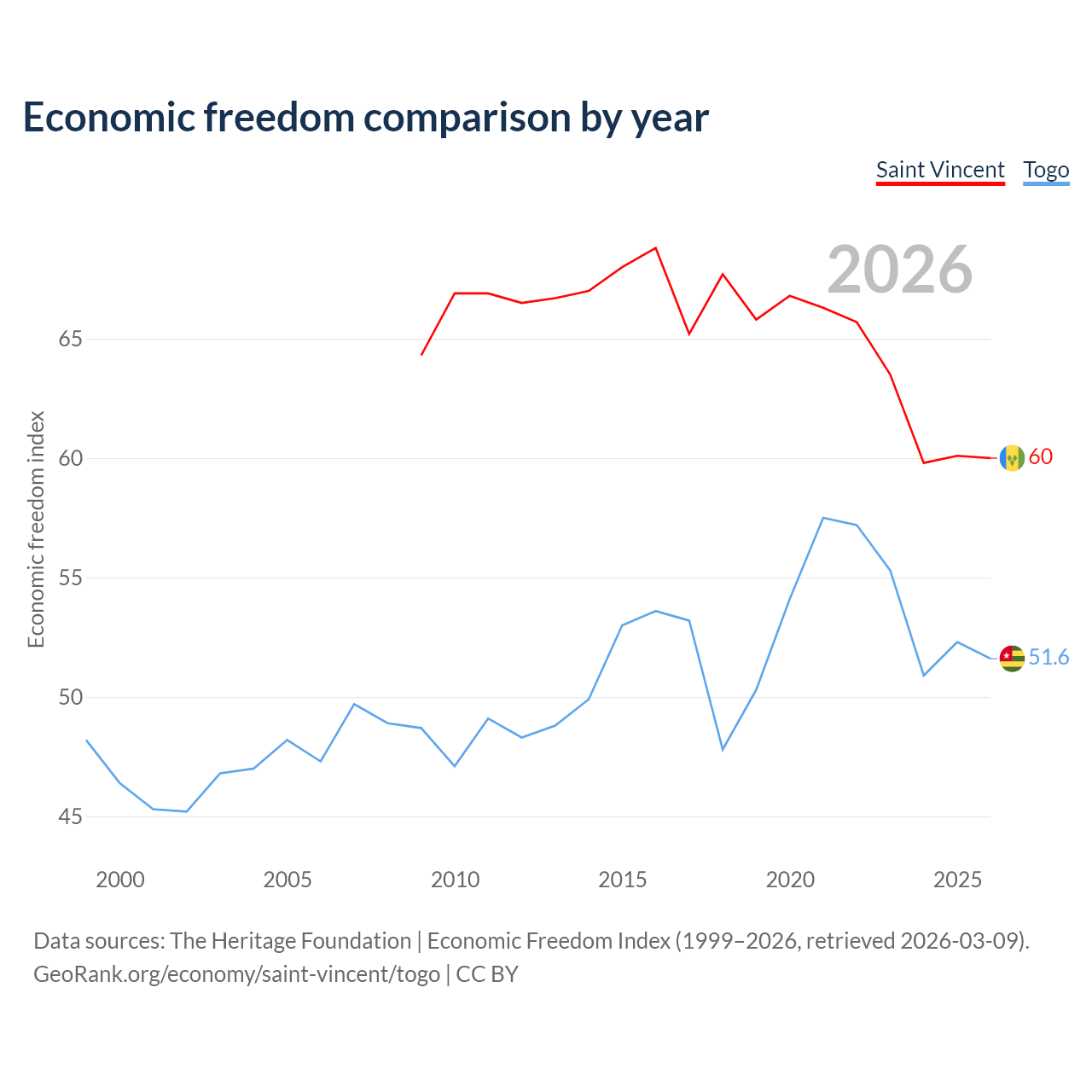 The Economic Freedom Index for Saint Vincent is 60, ranking 98/197, compared to 51.6 for Togo, ranking 153/197. The chart above displays a comparison of annual changes in economic freedom indexes.