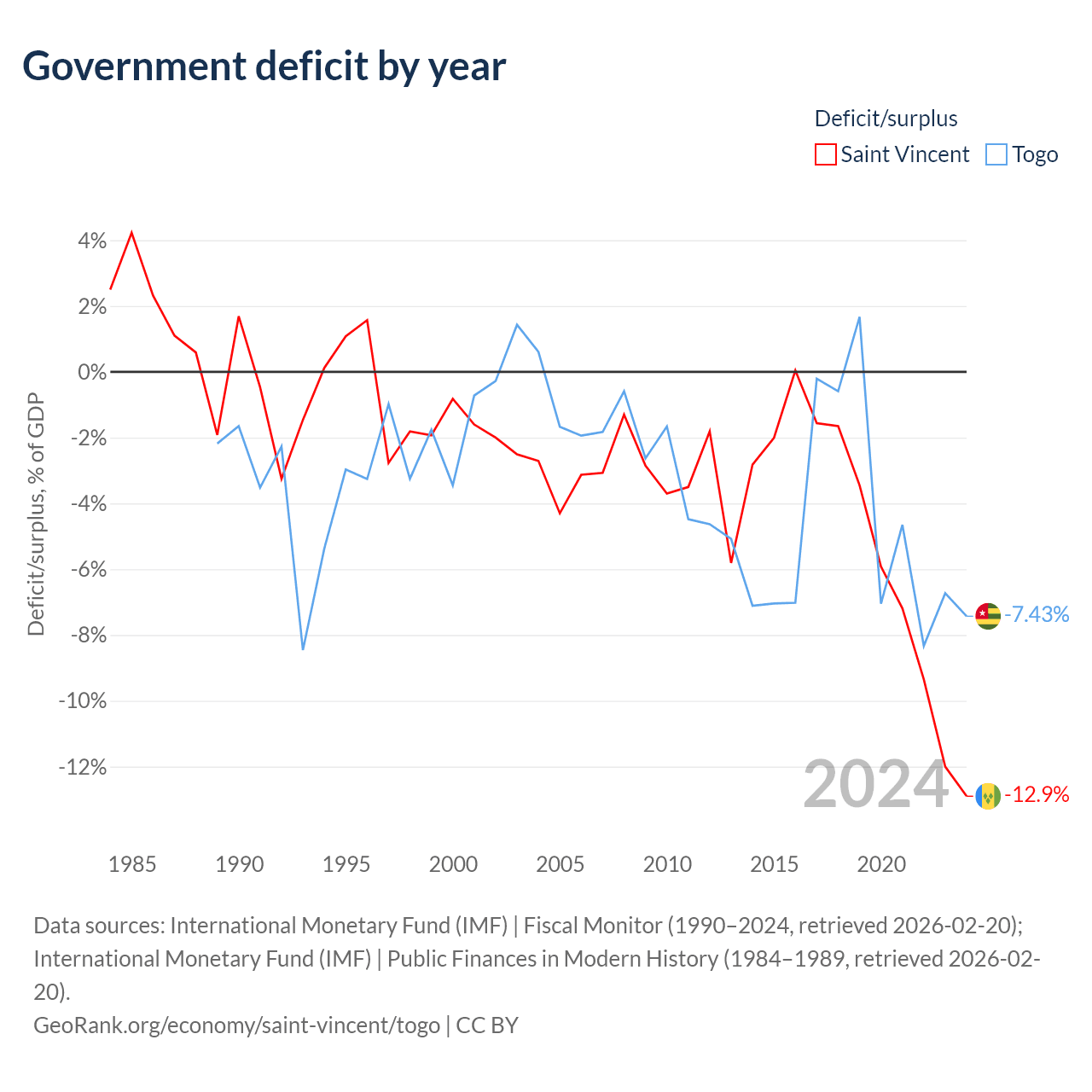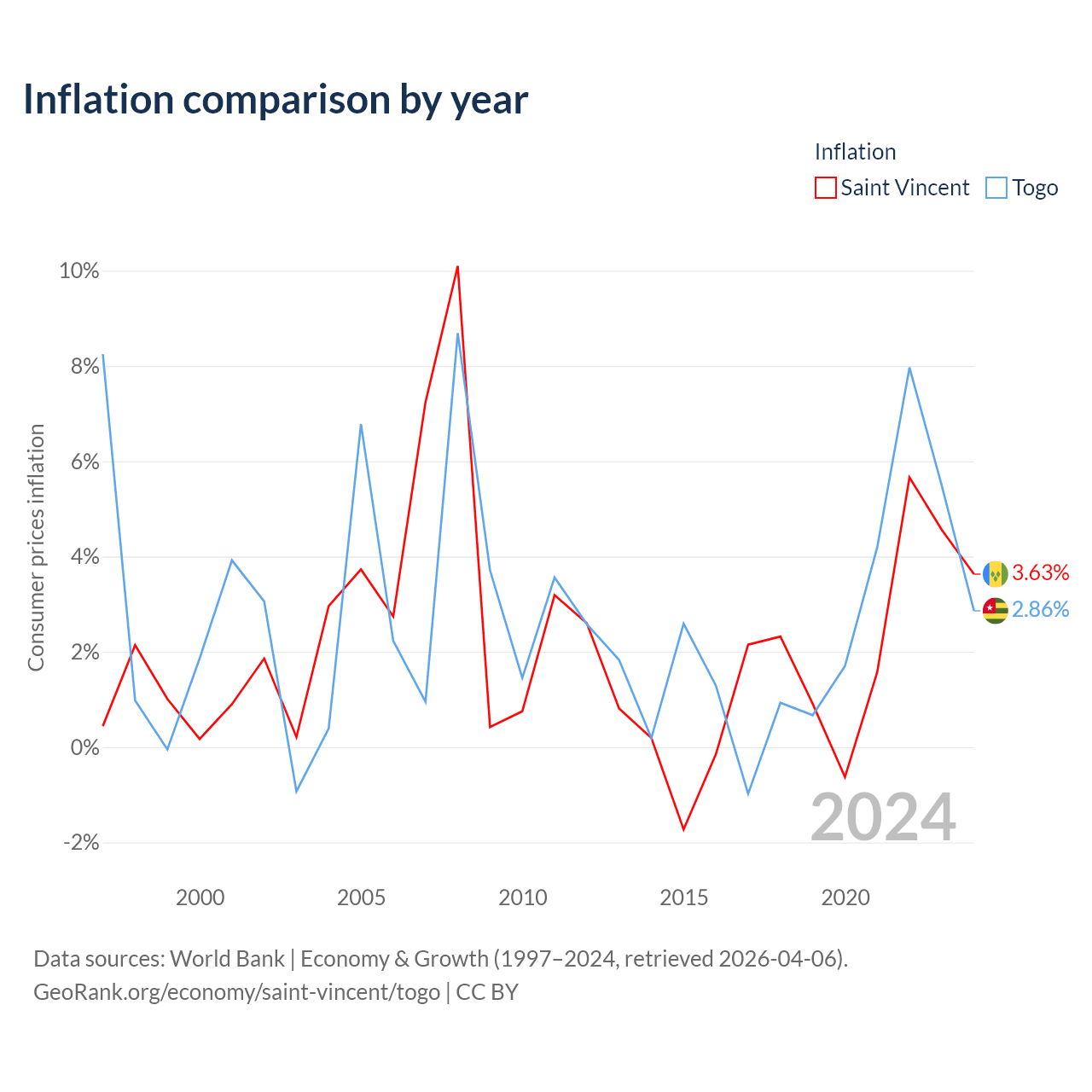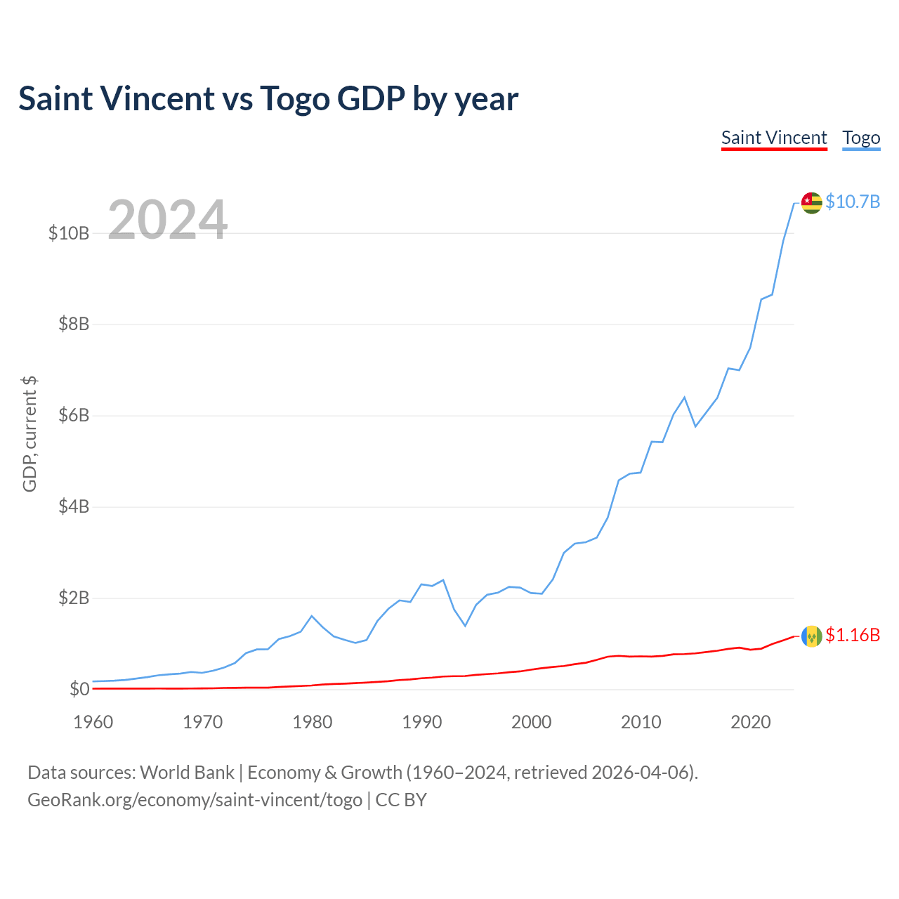 Saint Vincent has a GDP of $1.16B compared to $10.7B for Togo, ranking 186/197 and 154/197 by economy size, respectively.