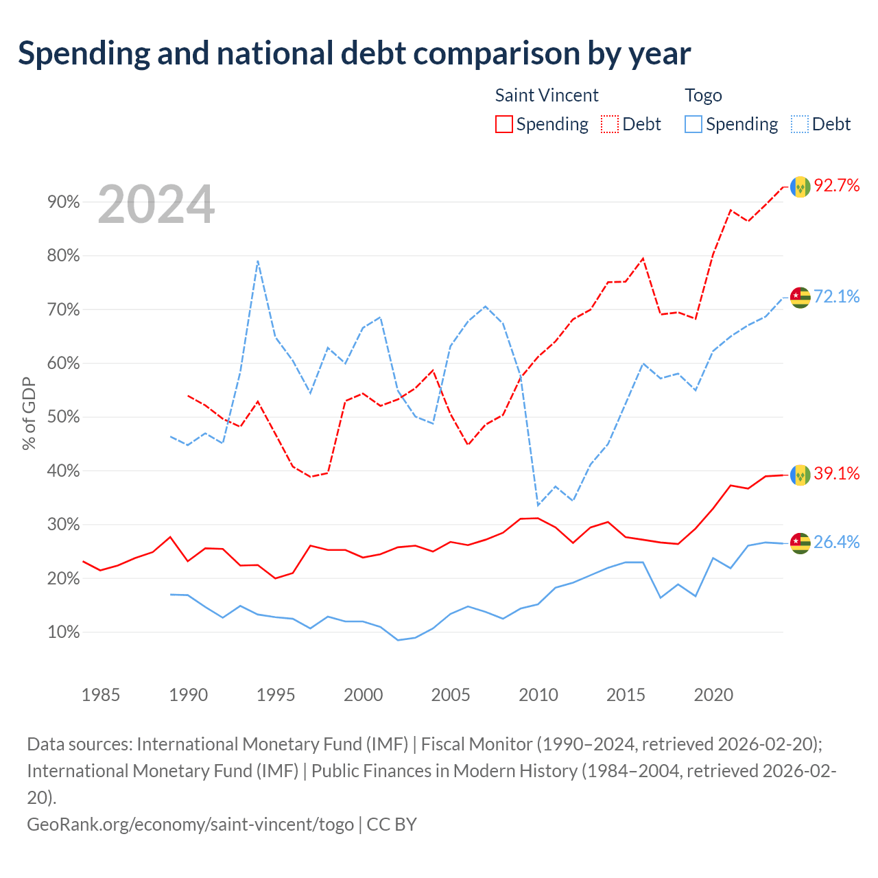 Saint Vincent has $1.07B in government debt (92.7% of GDP), compared to $7.68B (72.1% of GDP) in Togo.