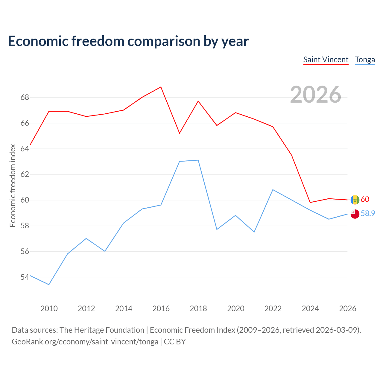 The Economic Freedom Index for Saint Vincent is 60, ranking 98/197, compared to 58.9 for Tonga, ranking 107/197. The chart above displays a comparison of annual changes in economic freedom indexes.