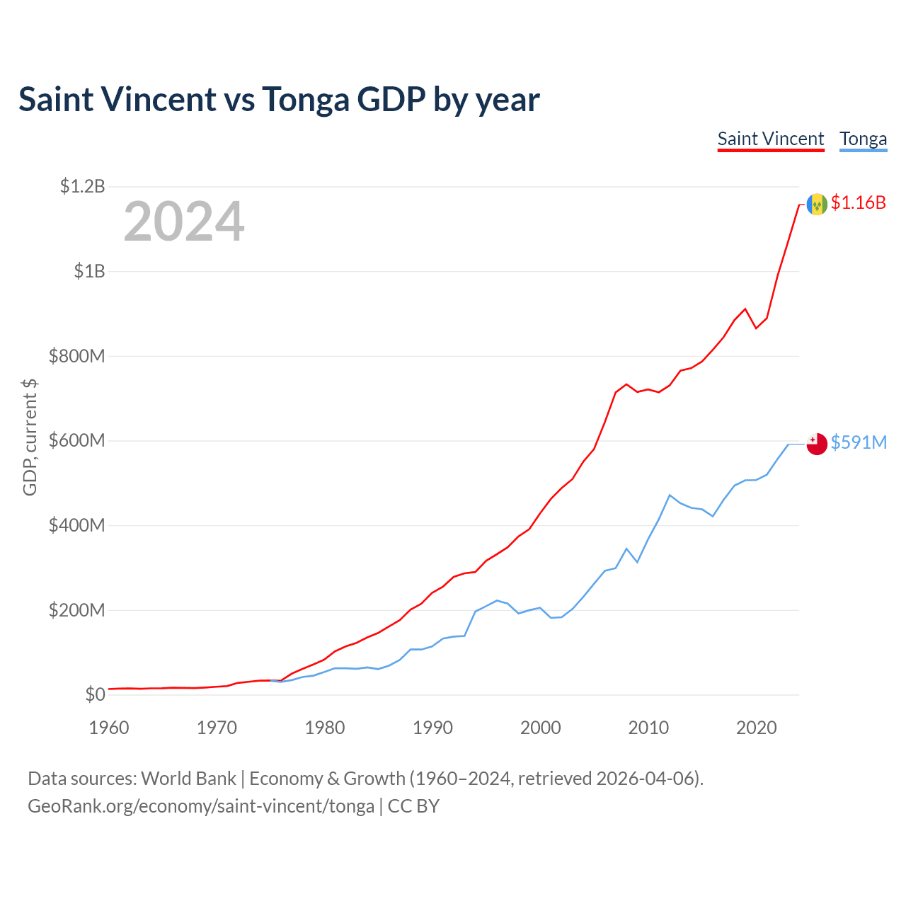 Saint Vincent has a GDP of $1.16B compared to $591M for Tonga, ranking 186/197 and 191/197 by economy size, respectively.