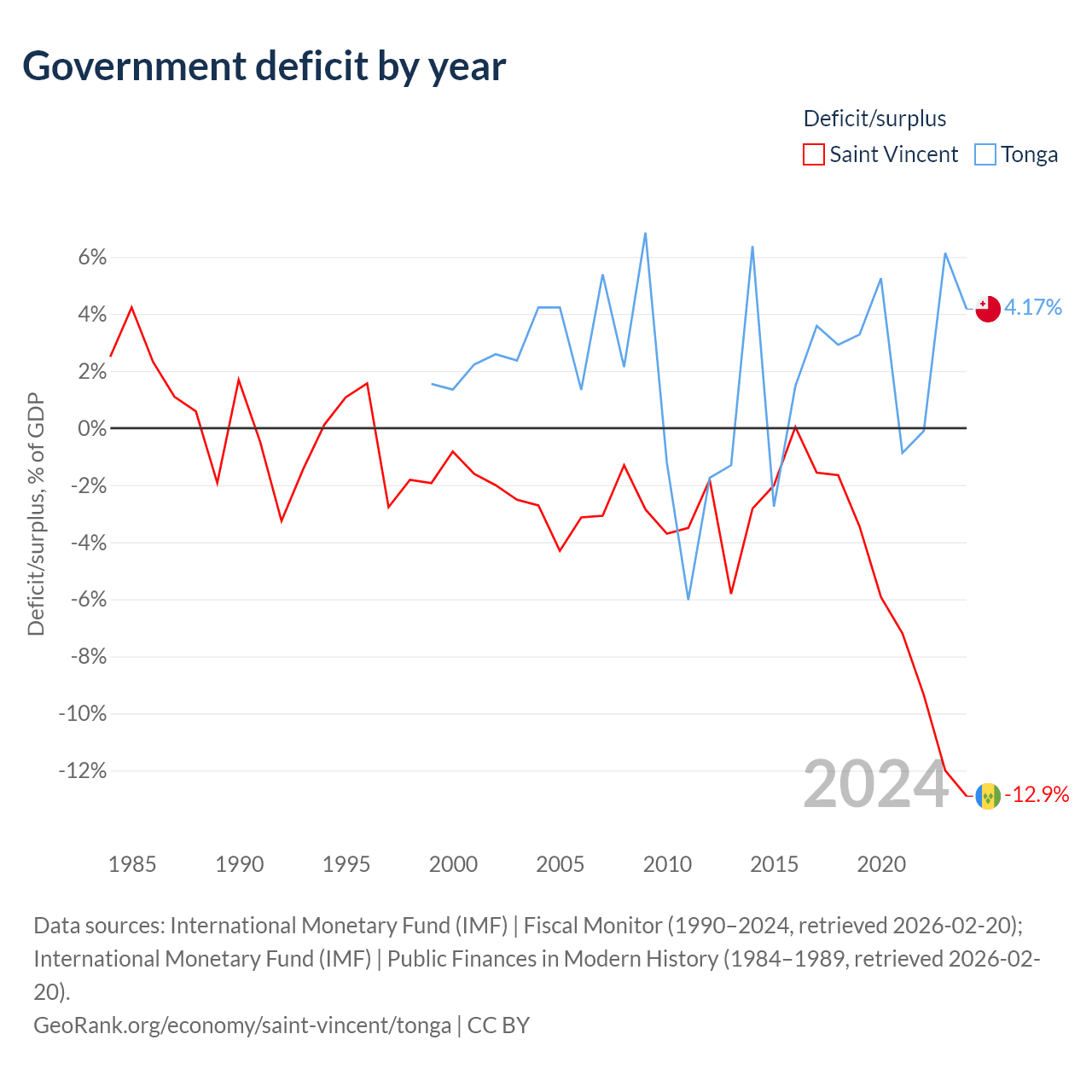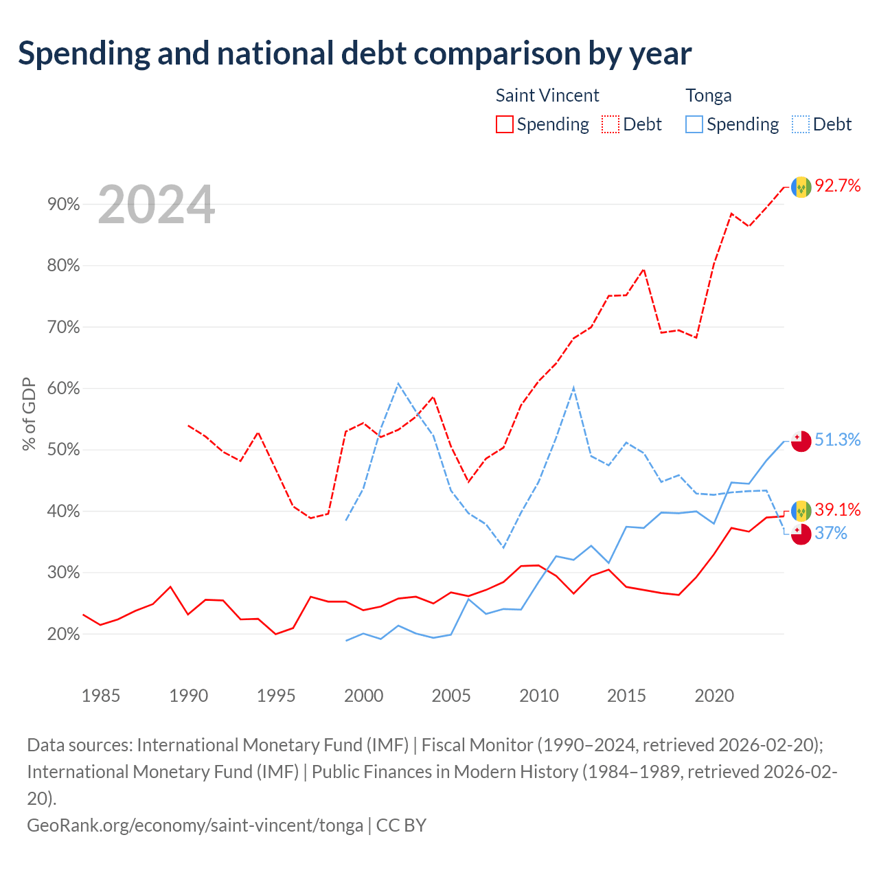 Saint Vincent has $1.07B in government debt (92.7% of GDP), compared to $256M (37% of GDP) in Tonga.