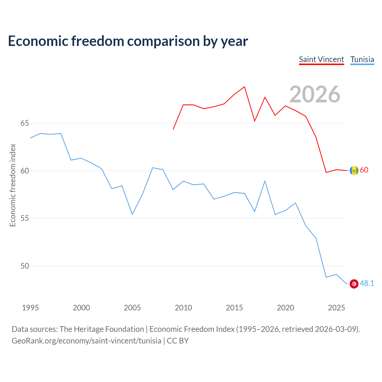 The Economic Freedom Index for Saint Vincent is 60, ranking 98/197, compared to 48.1 for Tunisia, ranking 172/197. The chart above displays a comparison of annual changes in economic freedom indexes.