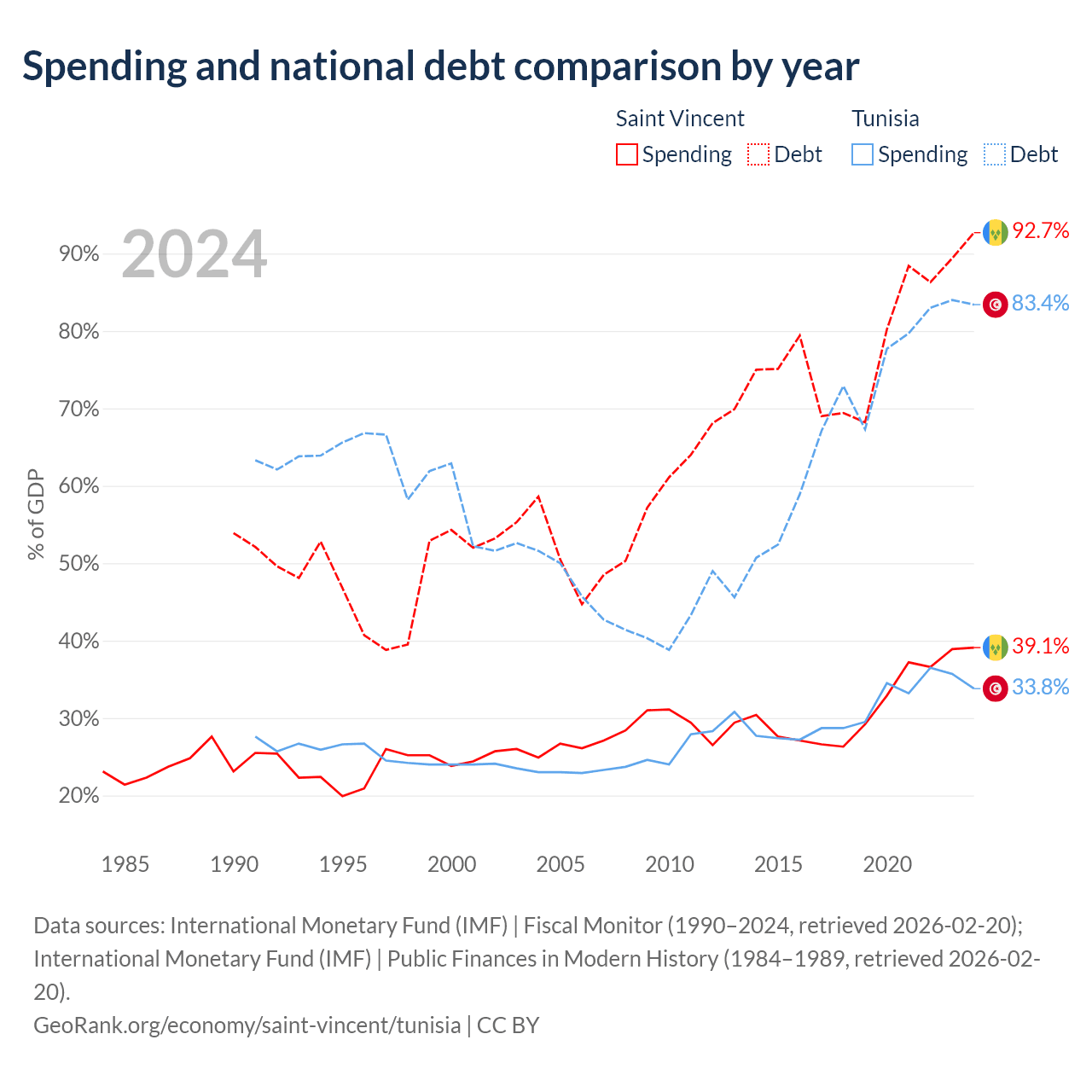 Saint Vincent has $1.07B in government debt (92.7% of GDP), compared to $42.8B (83.4% of GDP) in Tunisia.