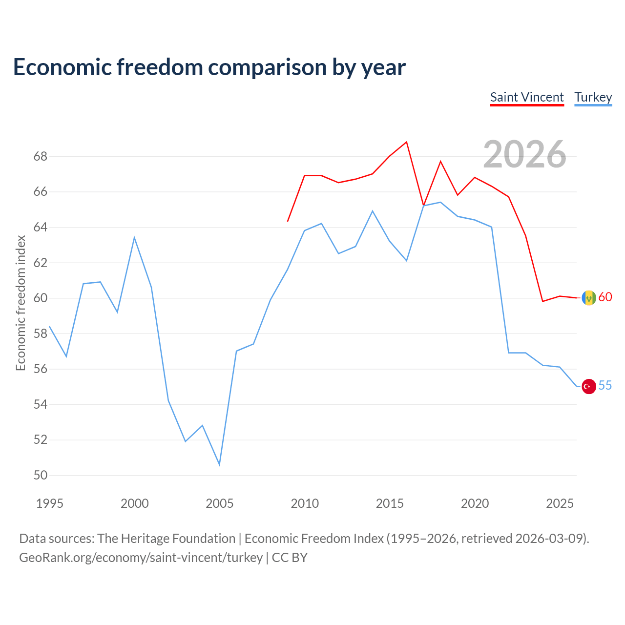 The Economic Freedom Index for Saint Vincent is 60, ranking 98/197, compared to 55 for Turkey, ranking 129/197. The chart above displays a comparison of annual changes in economic freedom indexes.