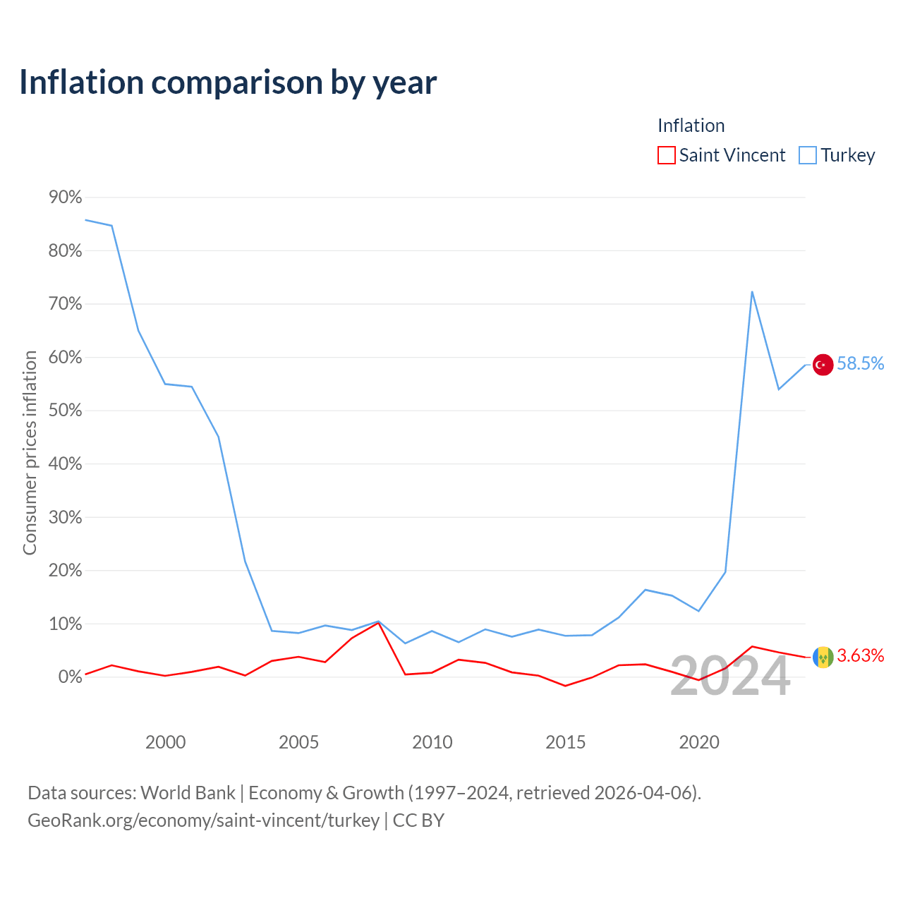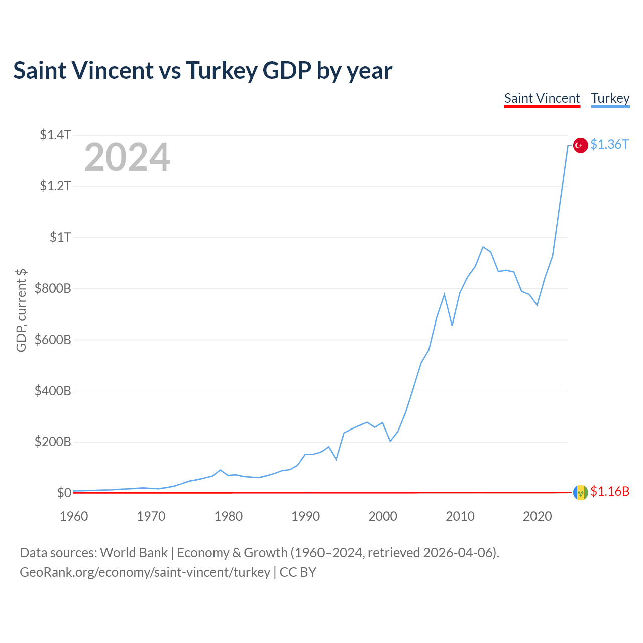 Saint Vincent has a GDP of $1.16B compared to $1.36T for Turkey, ranking 186/197 and 17/197 by economy size, respectively.