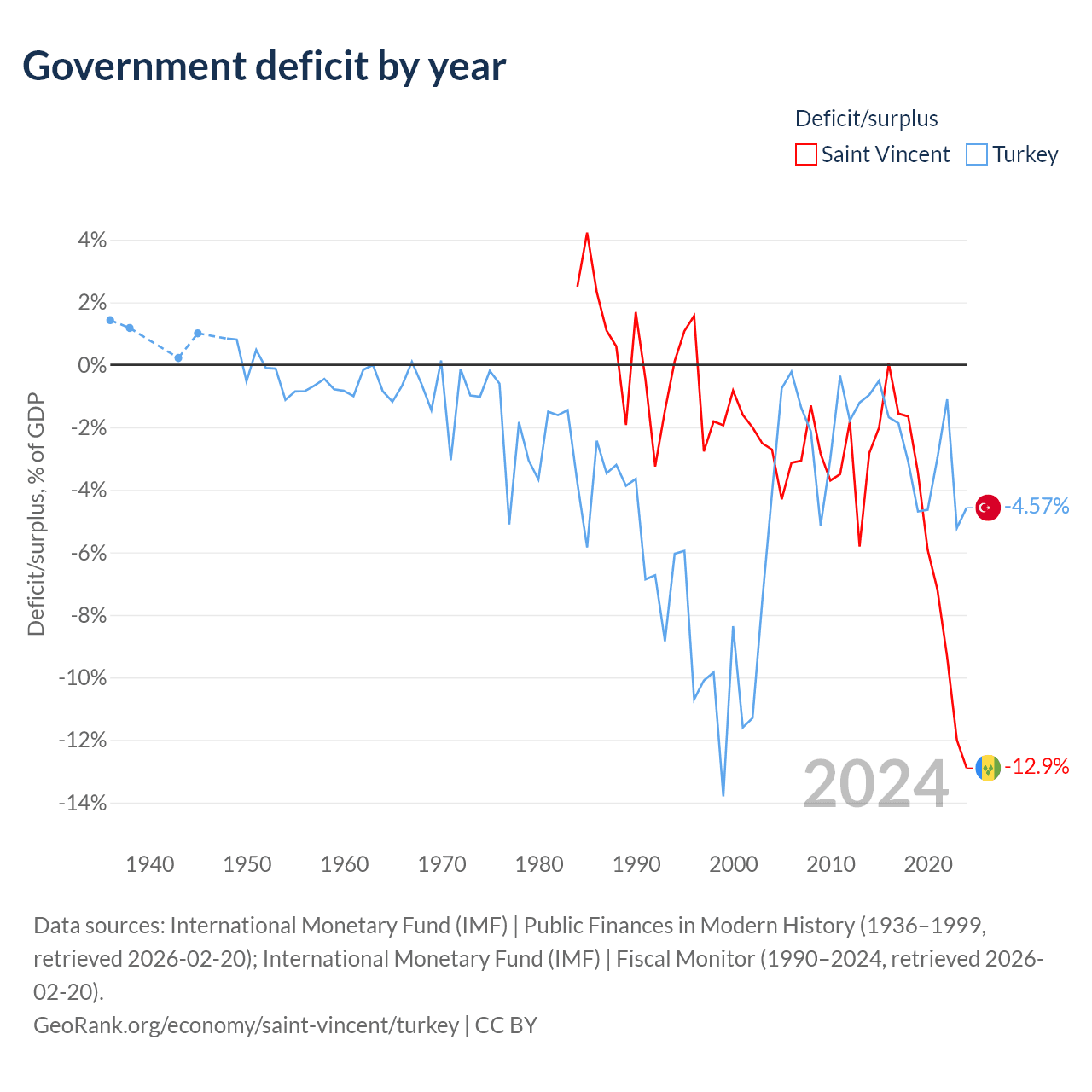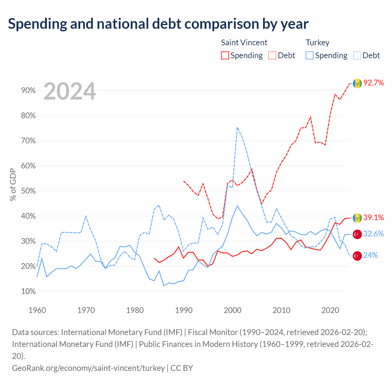 Saint Vincent has $1.07B in government debt (92.7% of GDP), compared to $327B (24% of GDP) in Turkey.