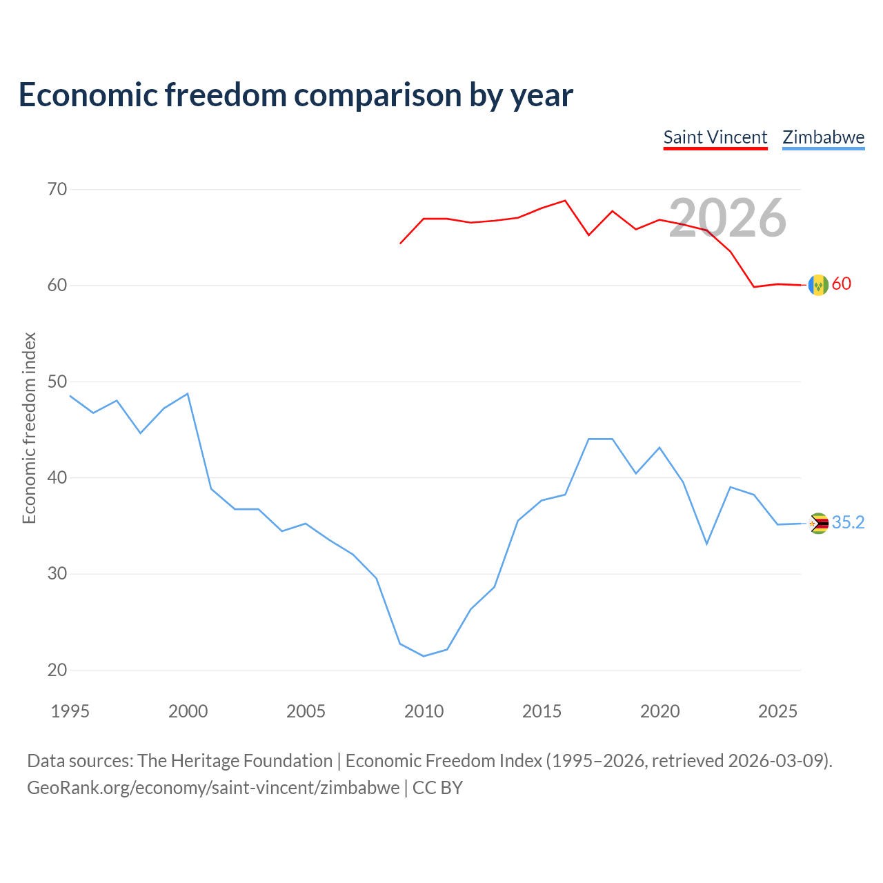 The Economic Freedom Index for Saint Vincent is 60, ranking 98/197, compared to 35.2 for Zimbabwe, ranking 190/197. The chart above displays a comparison of annual changes in economic freedom indexes.