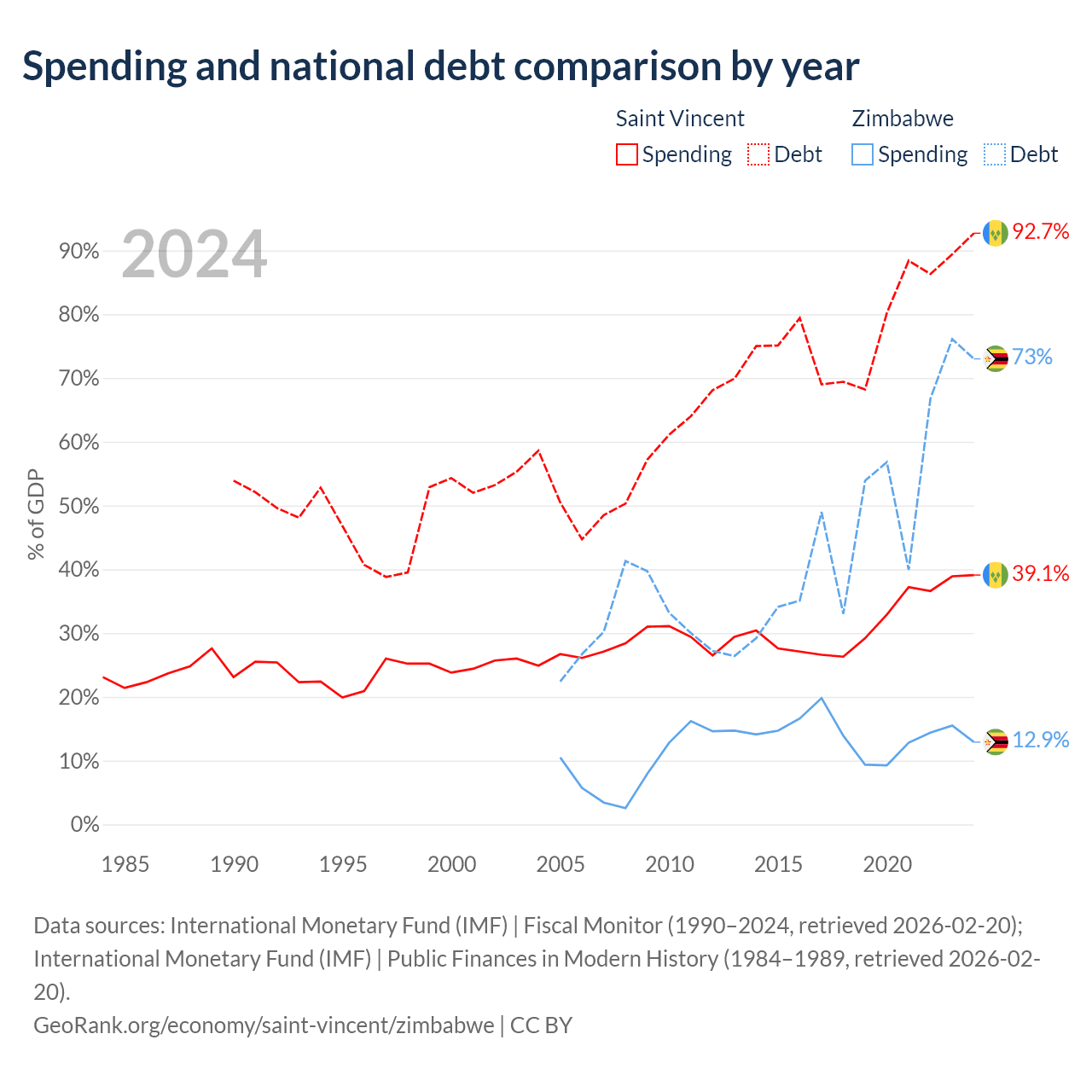 Saint Vincent has $1.07B in government debt (92.7% of GDP), compared to $30.3B (73% of GDP) in Zimbabwe.