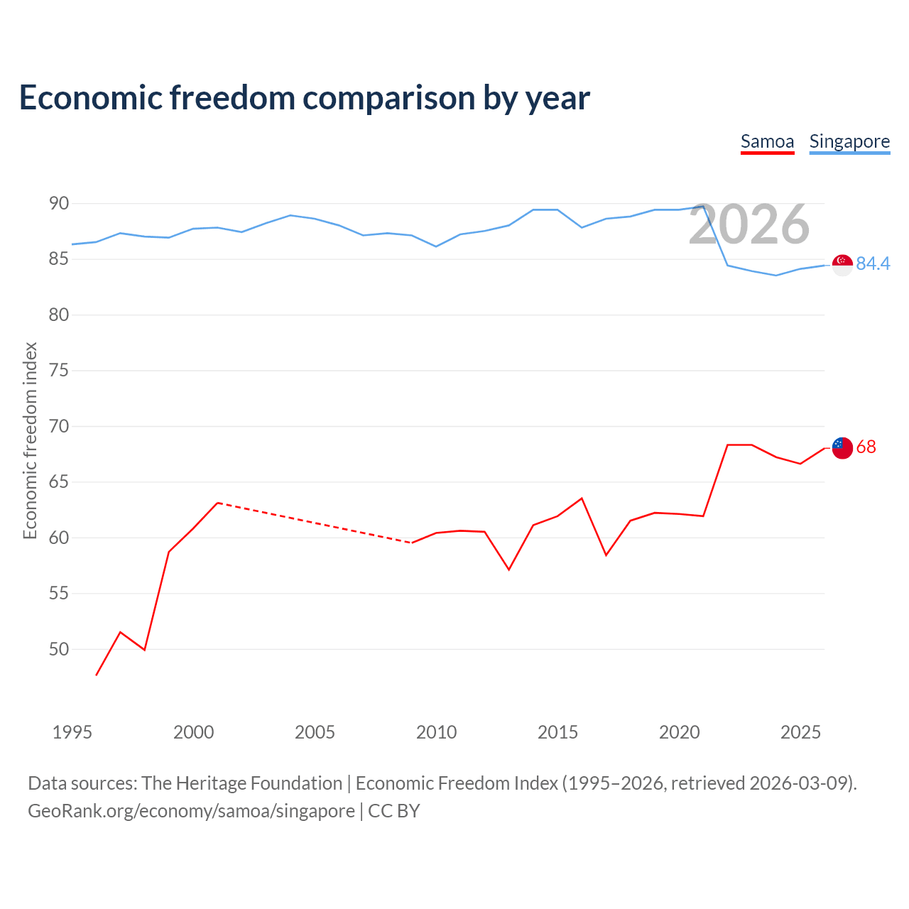 The Economic Freedom Index for Samoa is 68, ranking 52/197, compared to 84.4 for Singapore, ranking 1/197. The chart above displays a comparison of annual changes in economic freedom indexes.