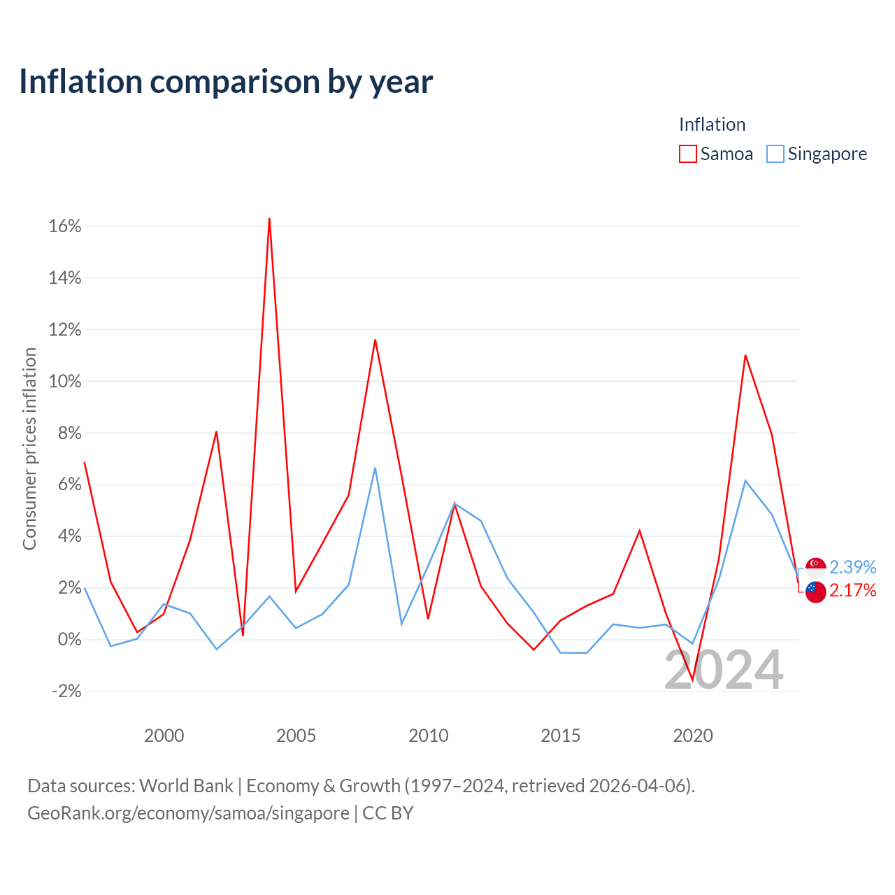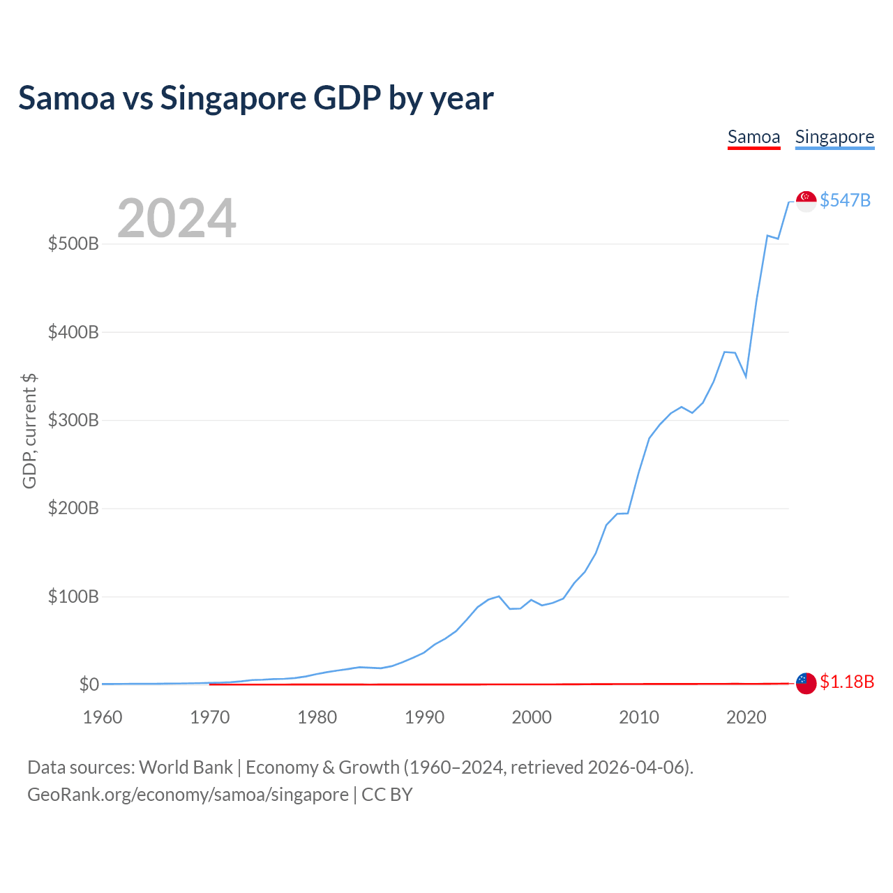 Samoa has a GDP of $1.18B compared to $547B for Singapore, ranking 185/197 and 28/197 by economy size, respectively.