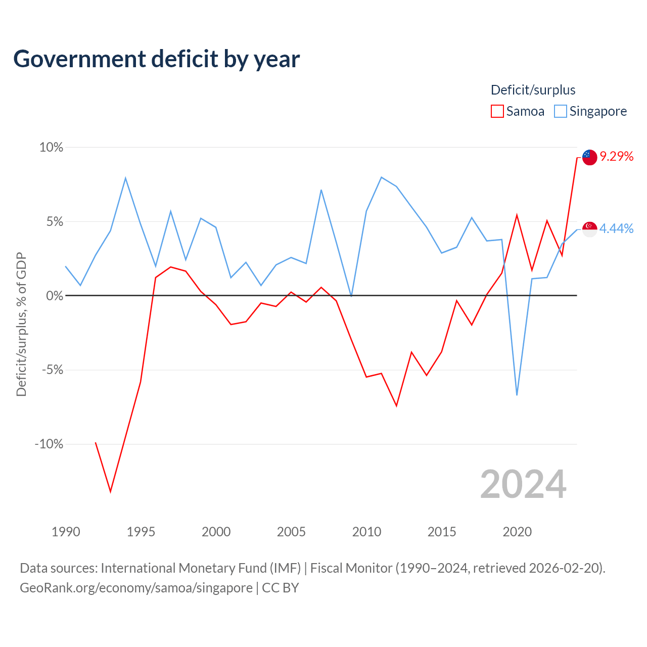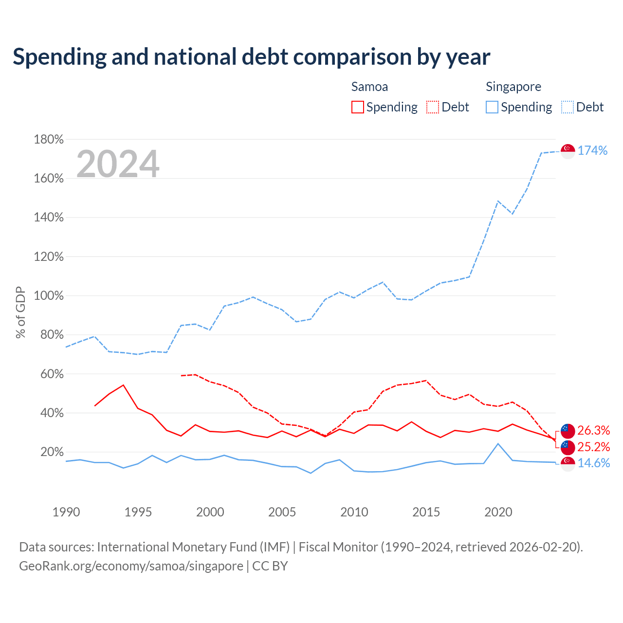 Samoa has $296M in government debt (25.2% of GDP), compared to $950B (173.5% of GDP) in Singapore.
