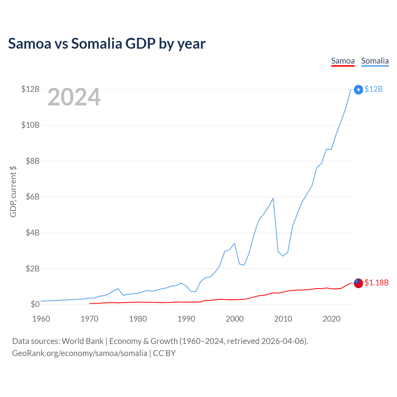 Samoa has a GDP of $1.18B compared to $12B for Somalia, ranking 185/197 and 150/197 by economy size, respectively.