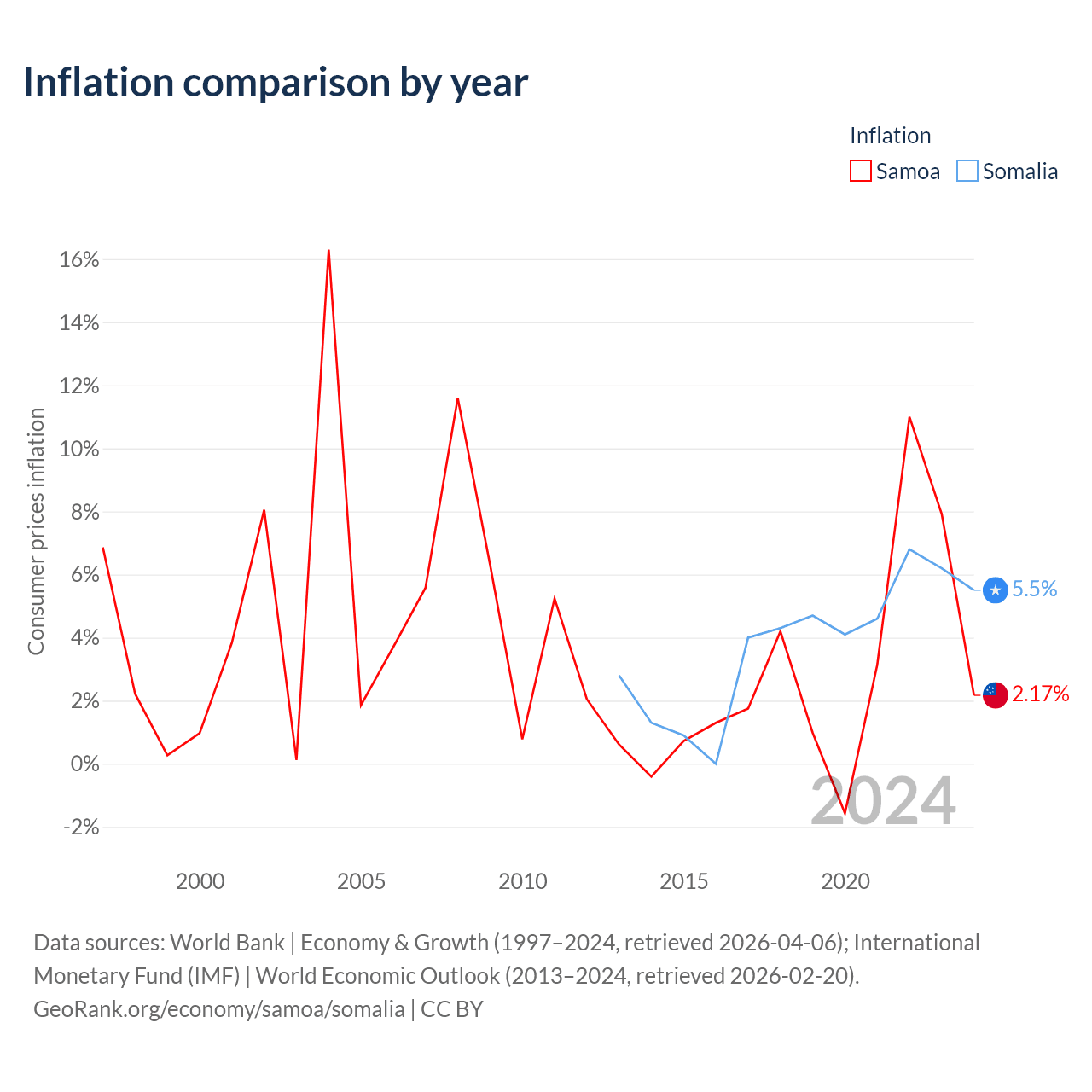 Over the past 12 years, Samoa has recorded an average annual inflation rate of 2.65%, compared with 3.77% in Somalia. In 2024, inflation was 2.17% in Samoa and 5.5% in Somalia.