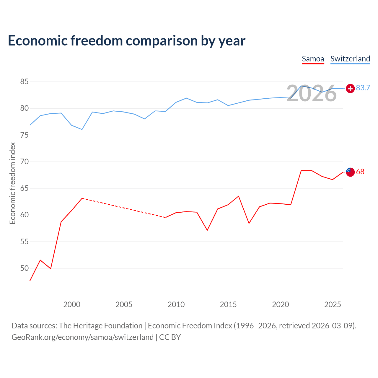 The Economic Freedom Index for Samoa is 68, ranking 52/197, compared to 83.7 for Switzerland, ranking 2/197. The chart above displays a comparison of annual changes in economic freedom indexes.