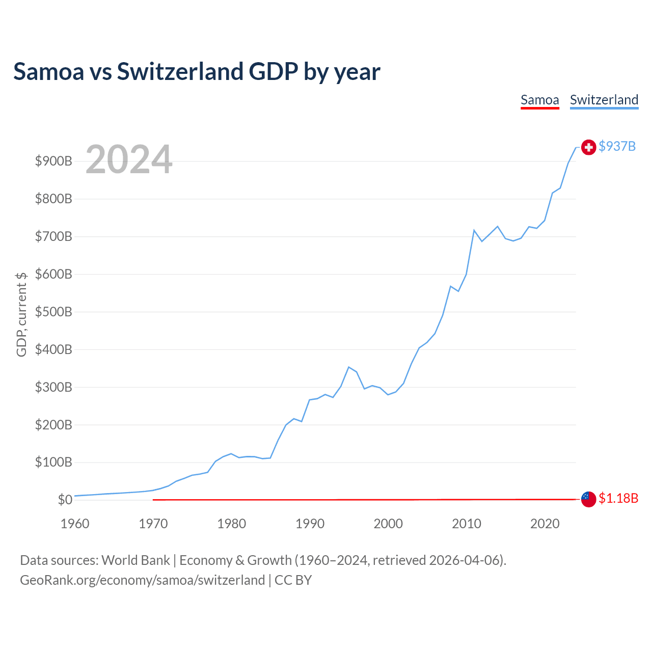 Samoa has a GDP of $1.18B compared to $937B for Switzerland, ranking 185/197 and 20/197 by economy size, respectively.