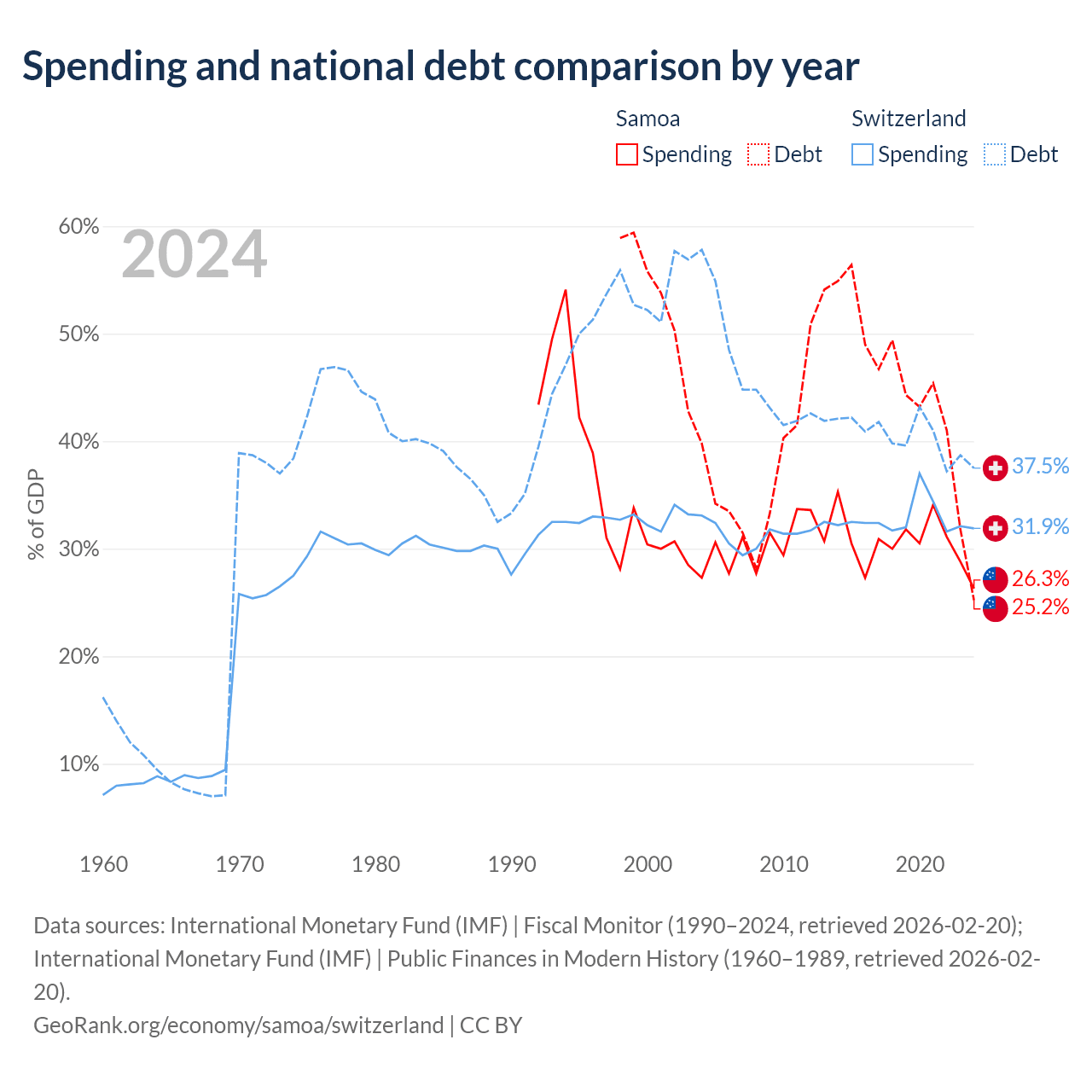 Samoa has $296M in government debt (25.2% of GDP), compared to $351B (37.5% of GDP) in Switzerland.