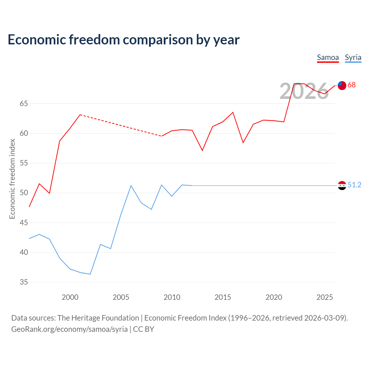 The Economic Freedom Index for Samoa is 68, ranking 52/197, compared to 51.2 for Syria, ranking 155/197. The chart above displays a comparison of annual changes in economic freedom indexes.