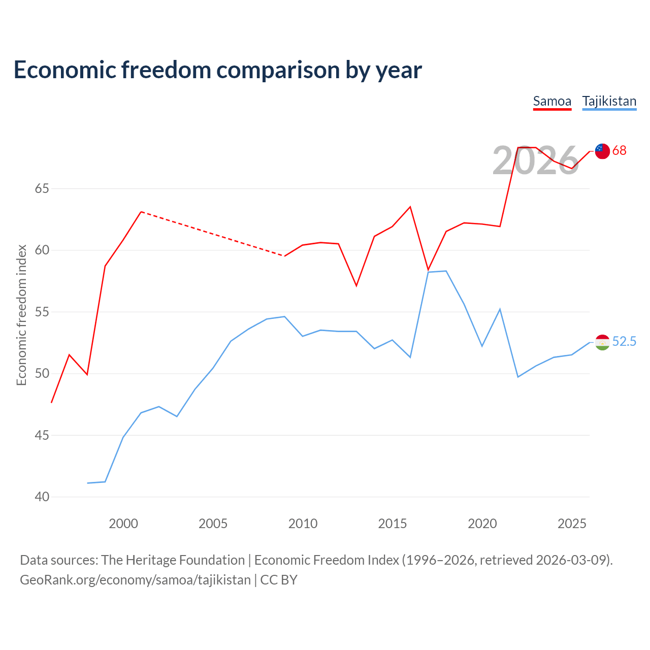 The Economic Freedom Index for Samoa is 68, ranking 52/197, compared to 52.5 for Tajikistan, ranking 147/197. The chart above displays a comparison of annual changes in economic freedom indexes.