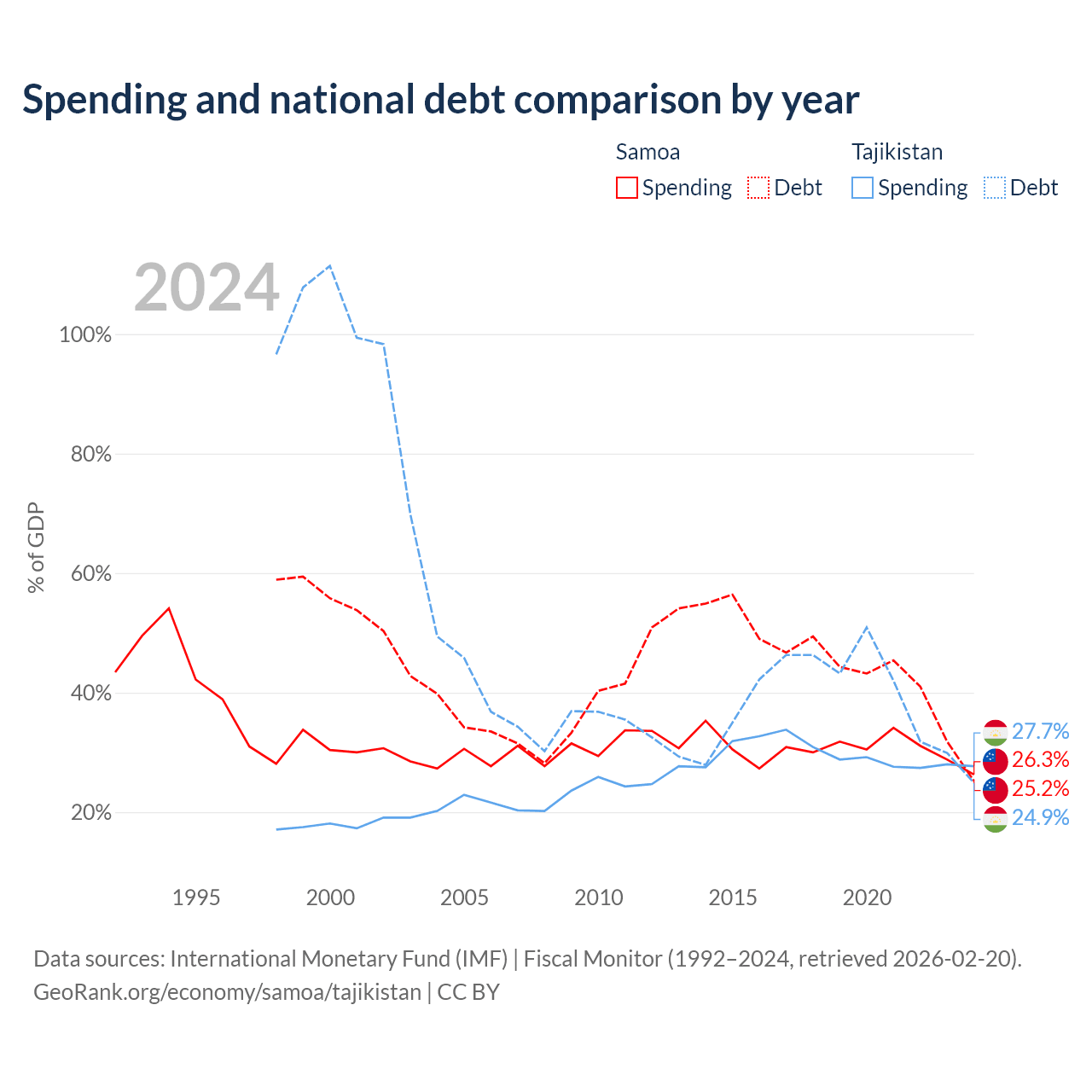 Samoa has $296M in government debt (25.2% of GDP), compared to $3.54B (24.9% of GDP) in Tajikistan.