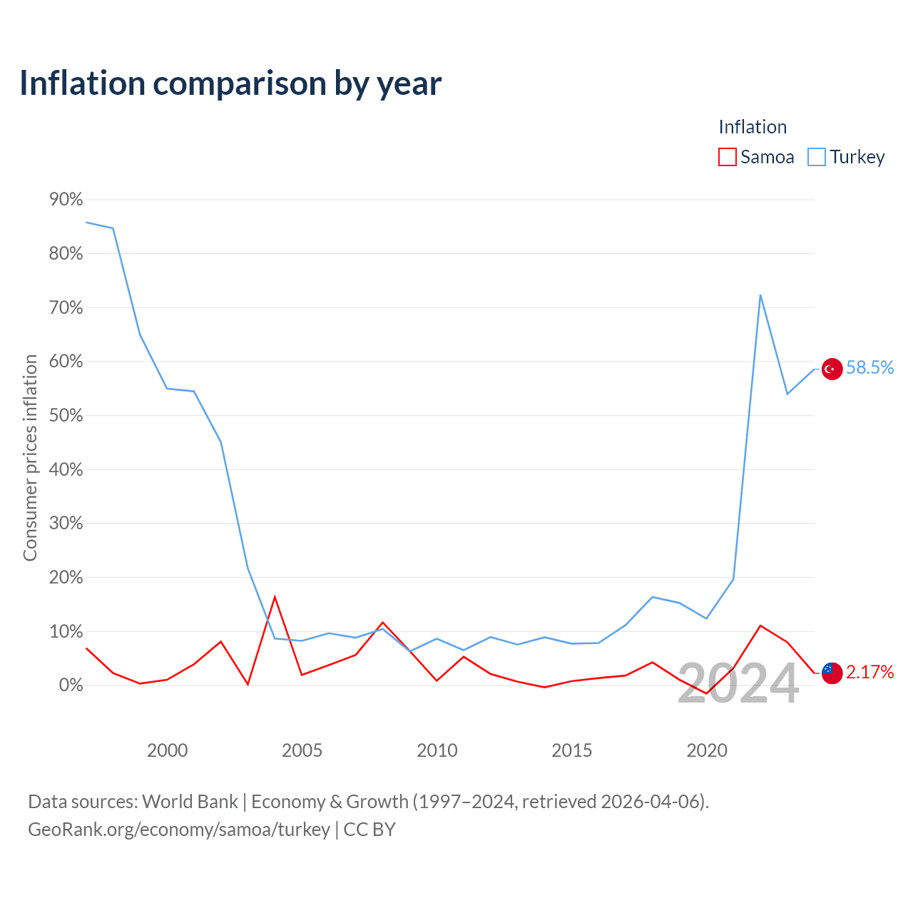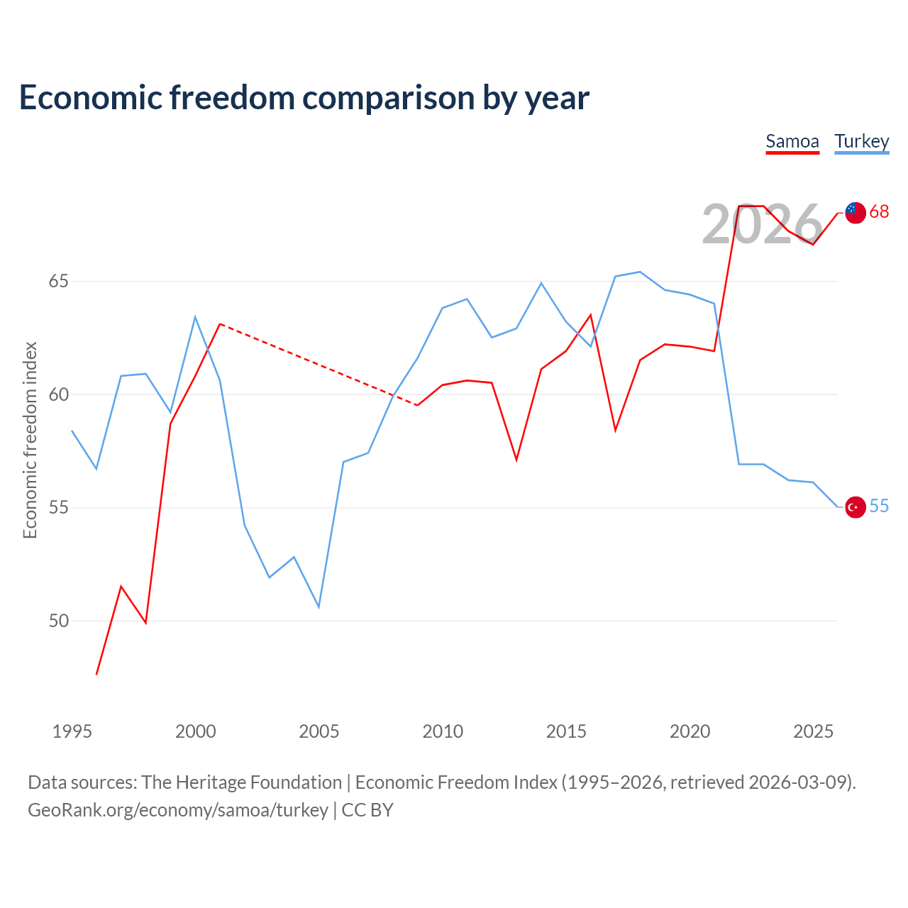 The Economic Freedom Index for Samoa is 68, ranking 52/197, compared to 55 for Turkey, ranking 129/197. The chart above displays a comparison of annual changes in economic freedom indexes.
