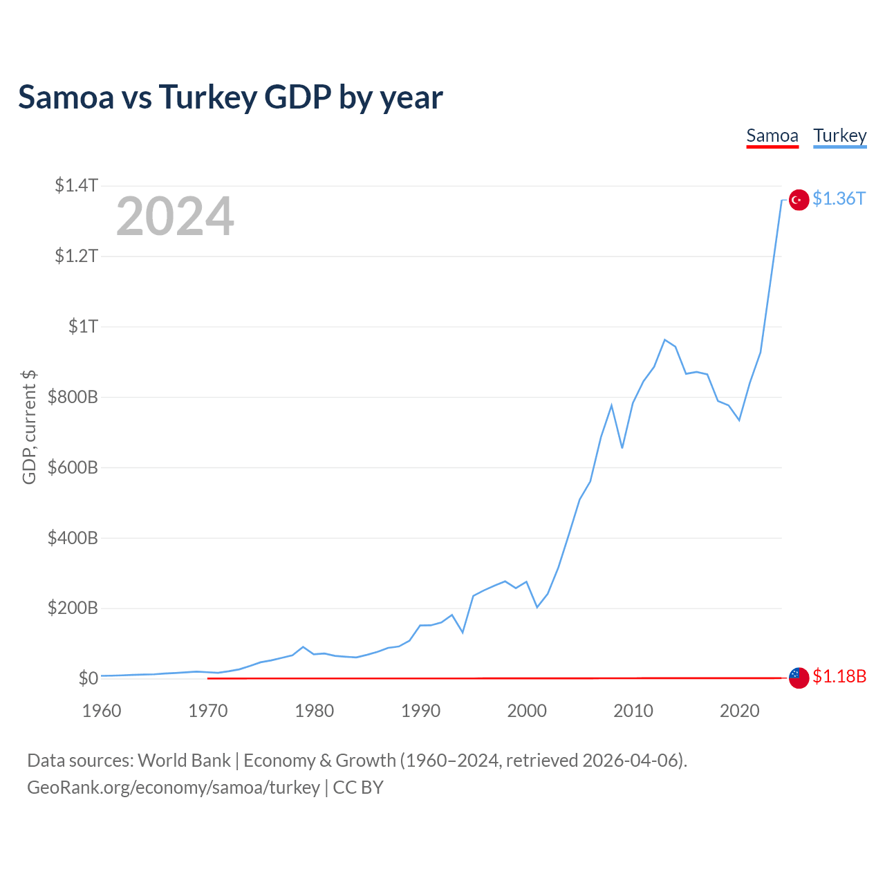 Samoa has a GDP of $1.18B compared to $1.36T for Turkey, ranking 185/197 and 17/197 by economy size, respectively.