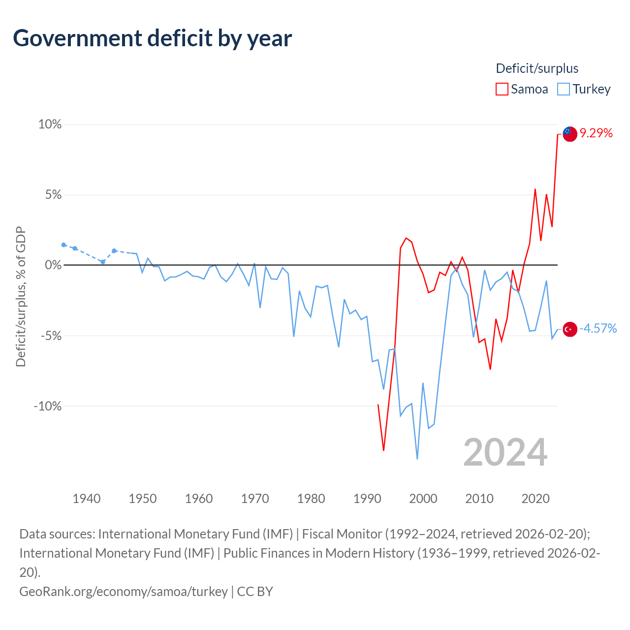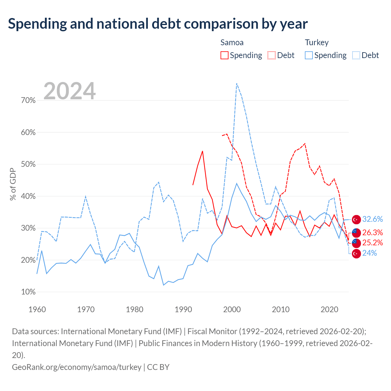 Samoa has $296M in government debt (25.2% of GDP), compared to $327B (24% of GDP) in Turkey.