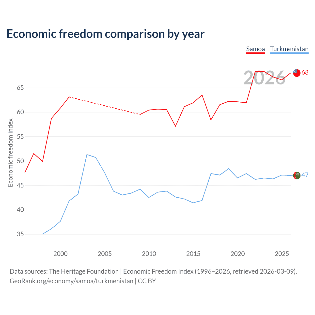 The Economic Freedom Index for Samoa is 68, ranking 52/197, compared to 47 for Turkmenistan, ranking 177/197. The chart above displays a comparison of annual changes in economic freedom indexes.
