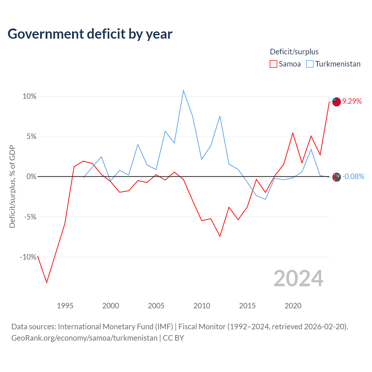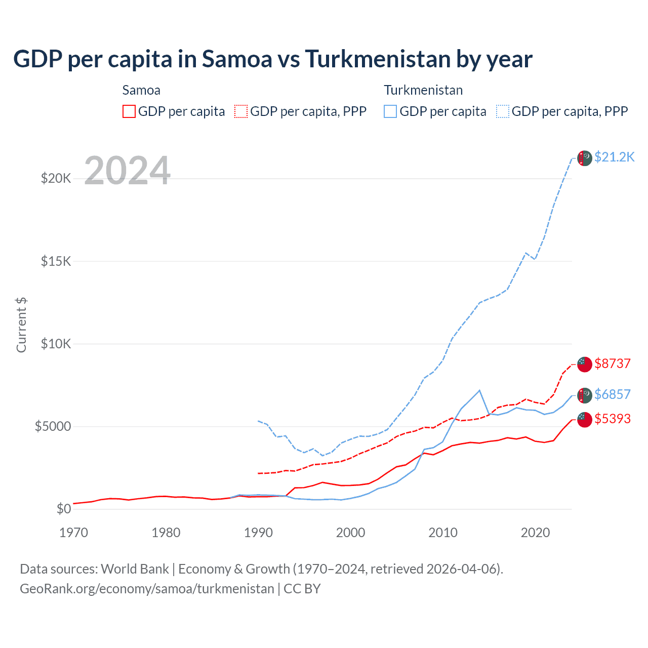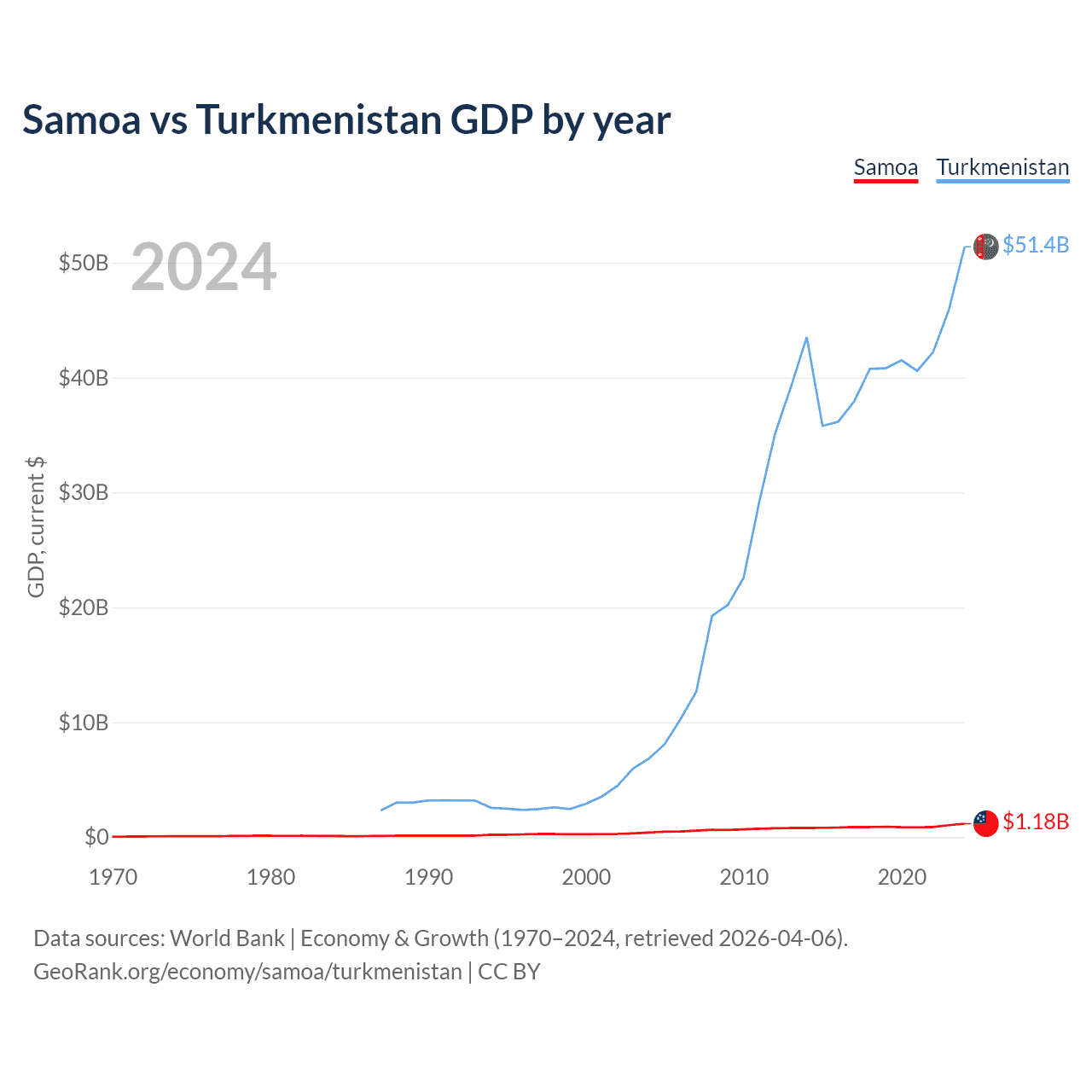 Samoa has a GDP of $1.18B compared to $51.4B for Turkmenistan, ranking 185/197 and 92/197 by economy size, respectively.