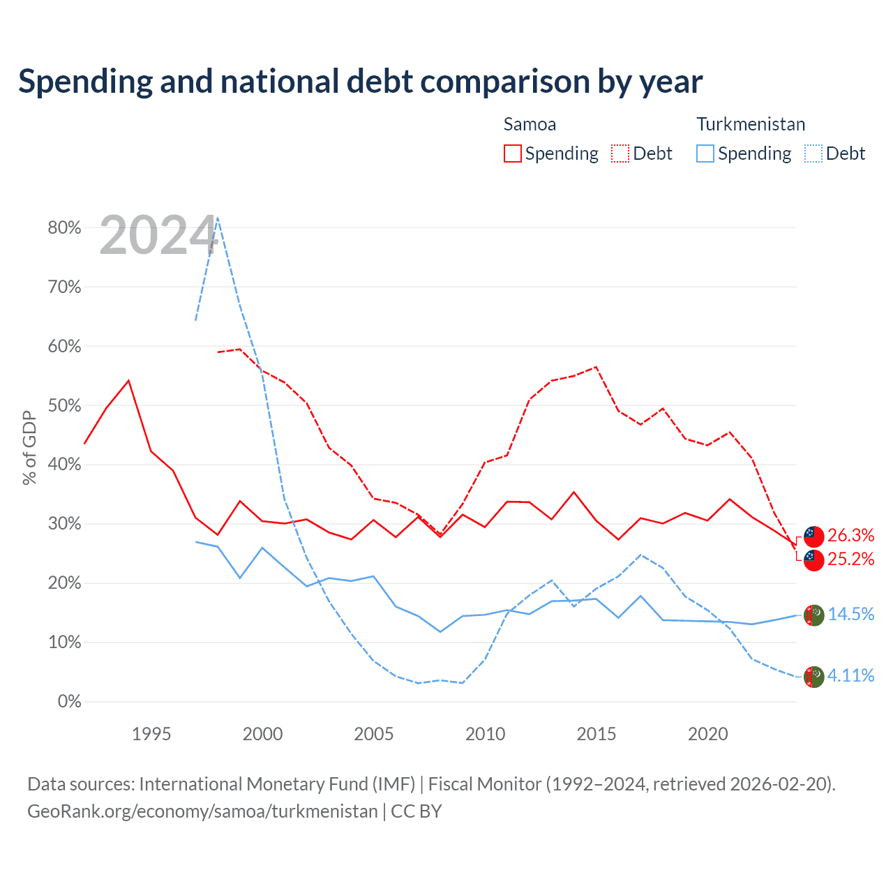Samoa has $296M in government debt (25.2% of GDP), compared to $2.11B (4.11% of GDP) in Turkmenistan.