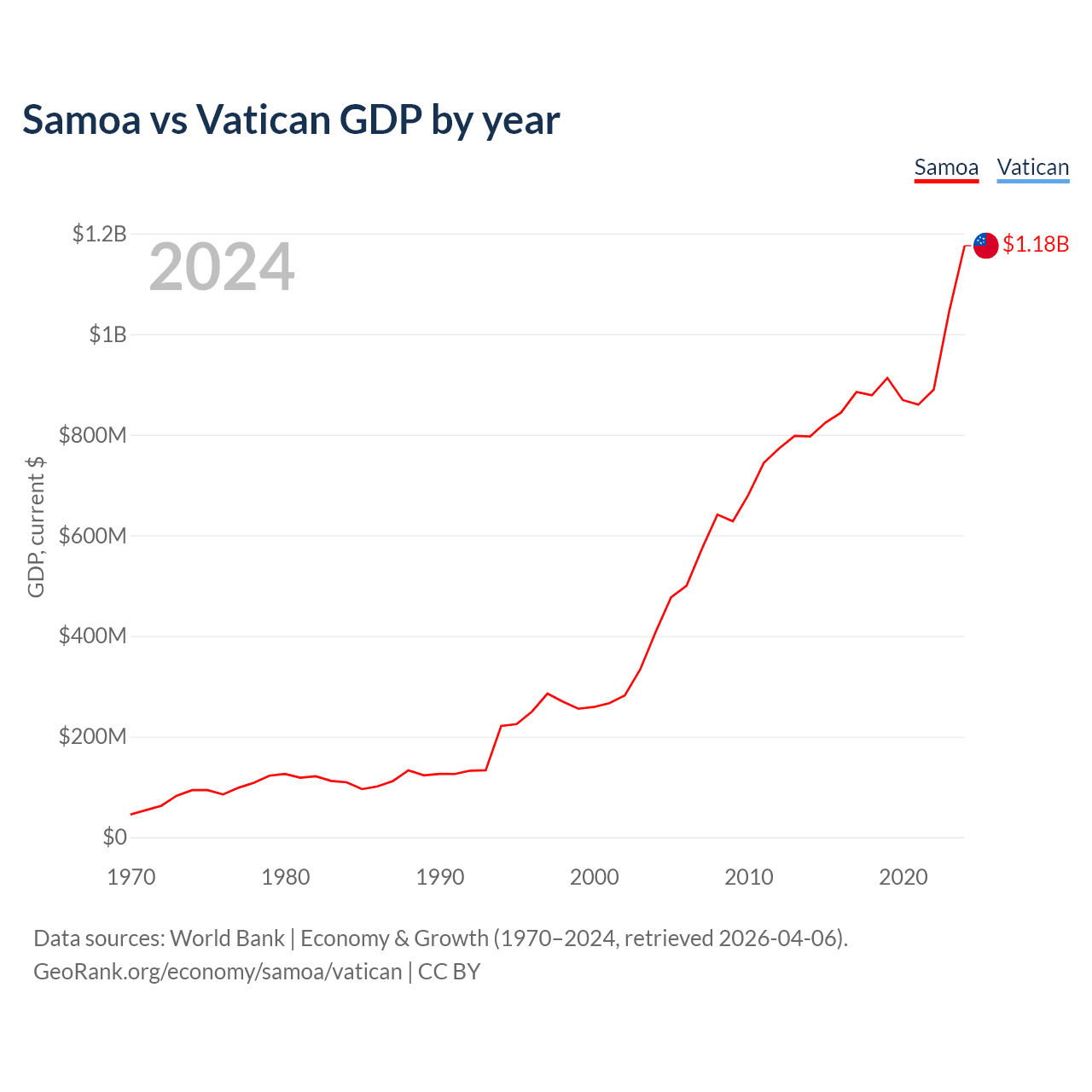 Samoa has a GDP of $1.18B compared to $19.8M for the Vatican, ranking 185/197 and 197/197 by economy size, respectively.