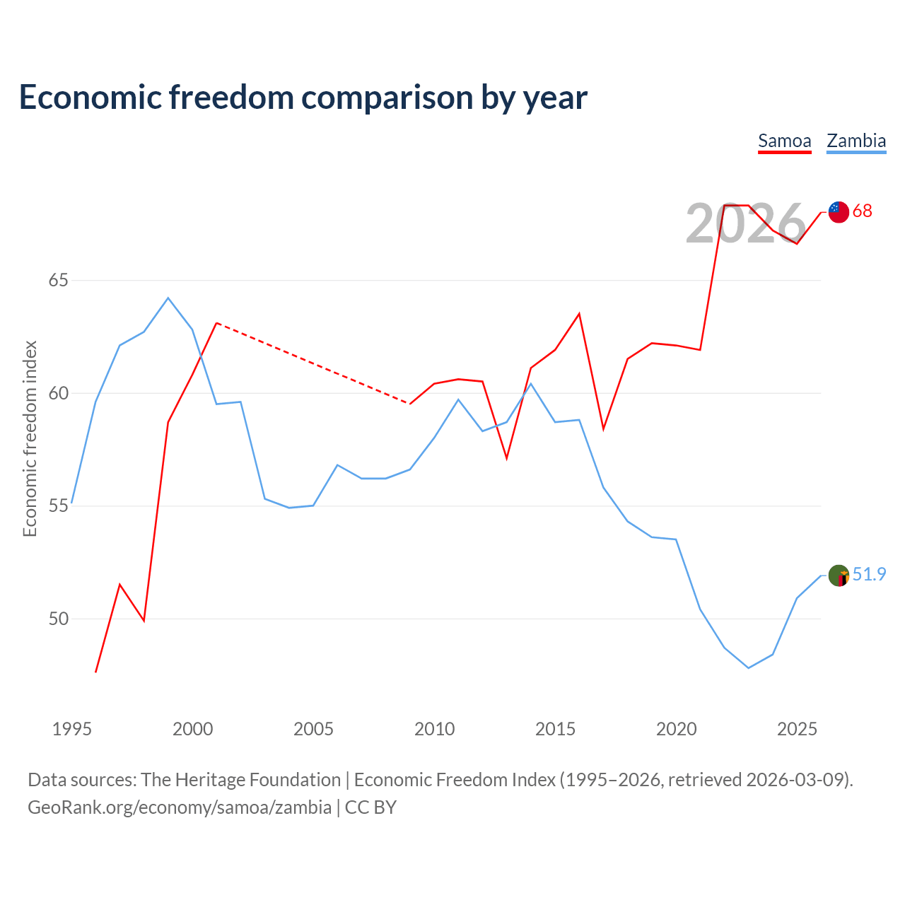 The Economic Freedom Index for Samoa is 68, ranking 52/197, compared to 51.9 for Zambia, ranking 152/197. The chart above displays a comparison of annual changes in economic freedom indexes.