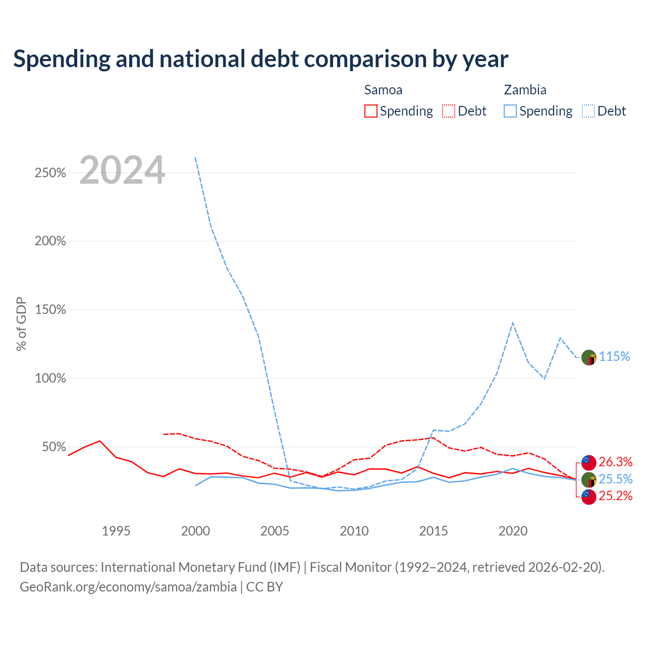 Samoa has $296M in government debt (25.2% of GDP), compared to $29.1B (114.9% of GDP) in Zambia.