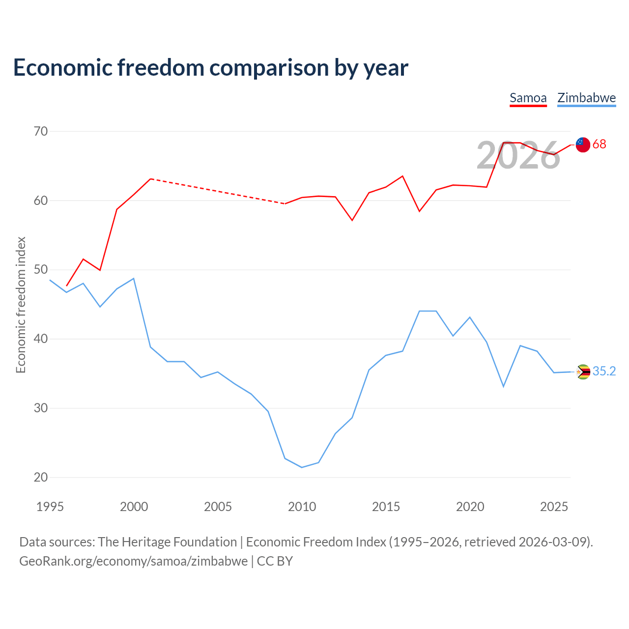 The Economic Freedom Index for Samoa is 68, ranking 52/197, compared to 35.2 for Zimbabwe, ranking 190/197. The chart above displays a comparison of annual changes in economic freedom indexes.