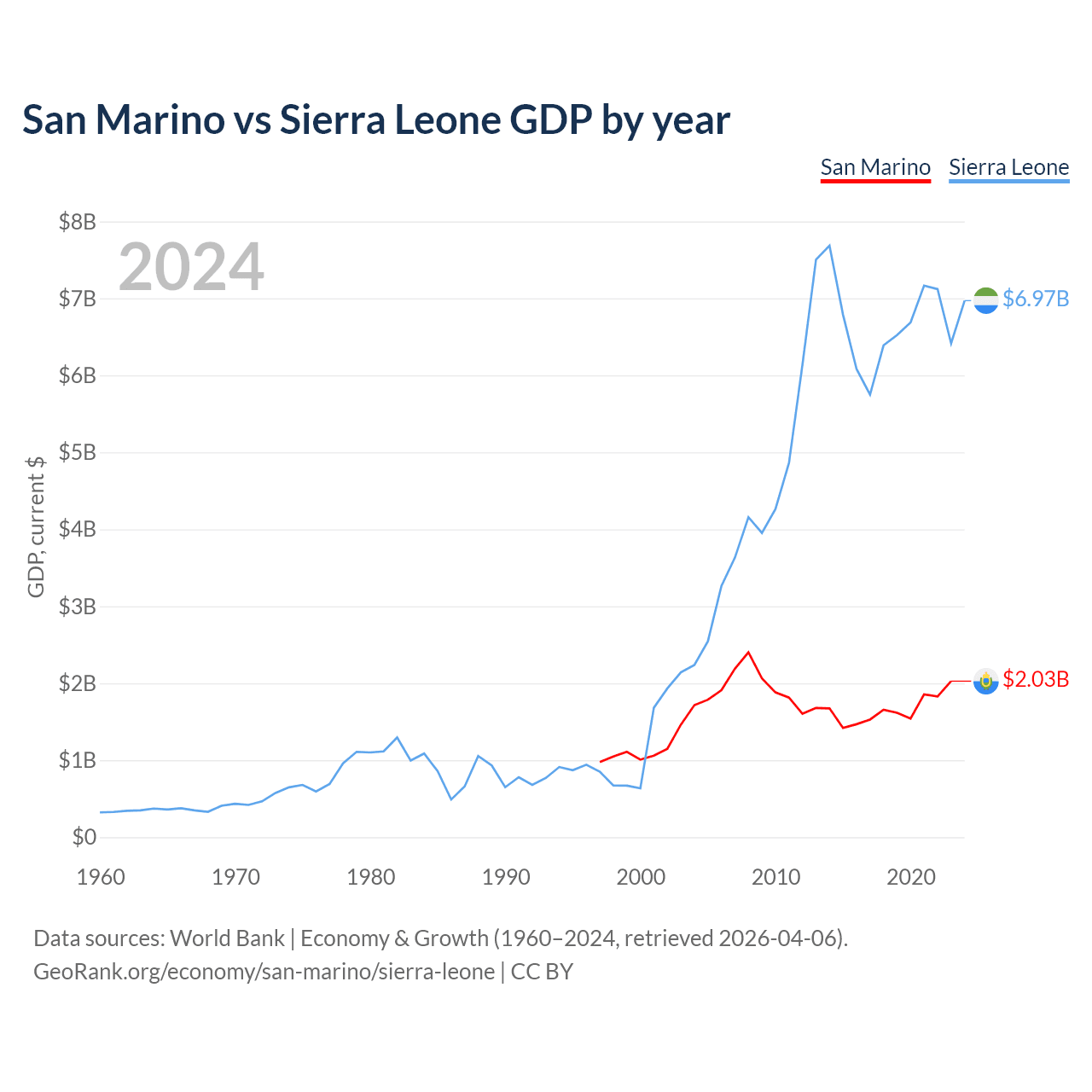 San Marino has a GDP of $2.03B compared to $6.97B for Sierra Leone, ranking 180/197 and 160/197 by economy size, respectively.