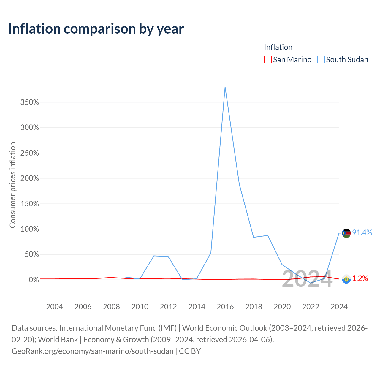 Over the past 16 years, San Marino has recorded an average annual inflation rate of 1.86%, compared with 63.7% in South Sudan. In 2024, inflation was 1.2% in San Marino and 91.4% in South Sudan.