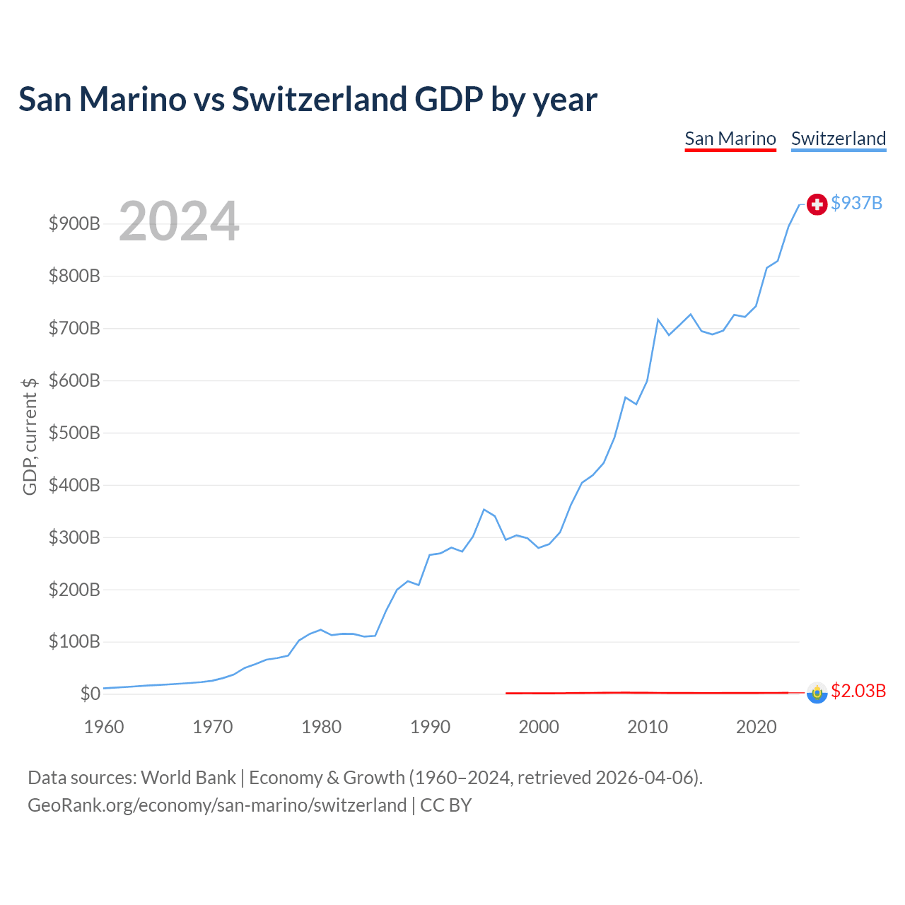 San Marino has a GDP of $2.03B compared to $937B for Switzerland, ranking 180/197 and 20/197 by economy size, respectively.