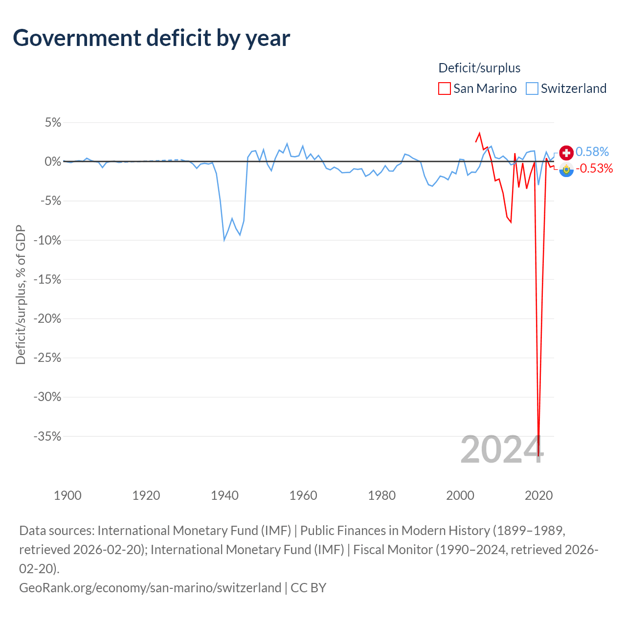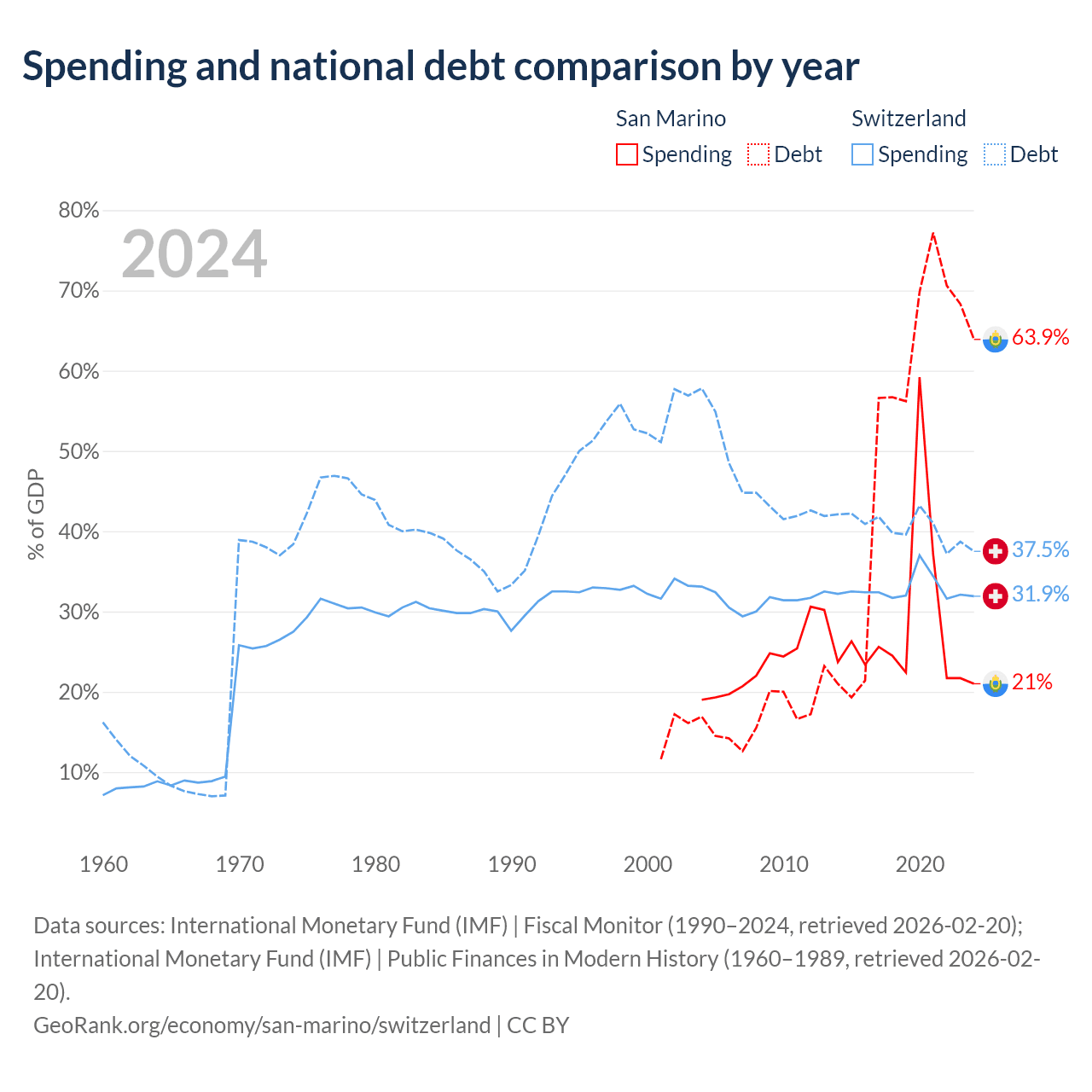 San Marino has $1.39B in government debt (63.9% of GDP), compared to $351B (37.5% of GDP) in Switzerland.