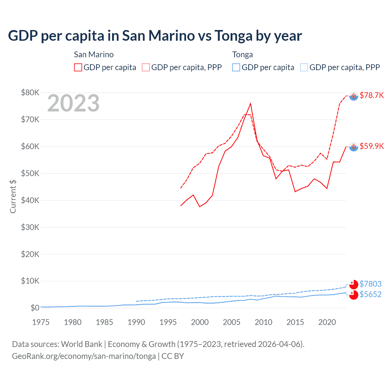 GDP per capita in San Marino vs Tonga by year