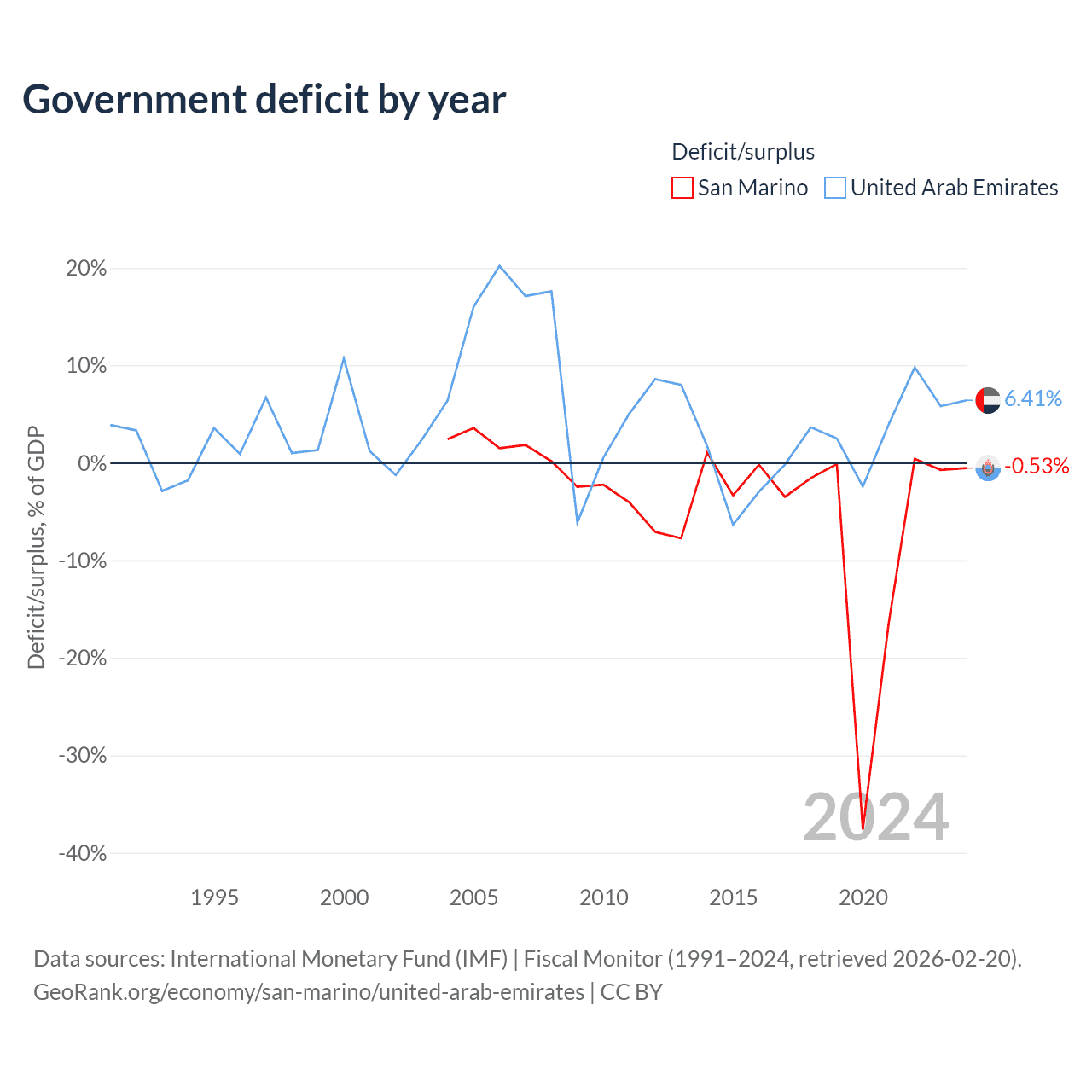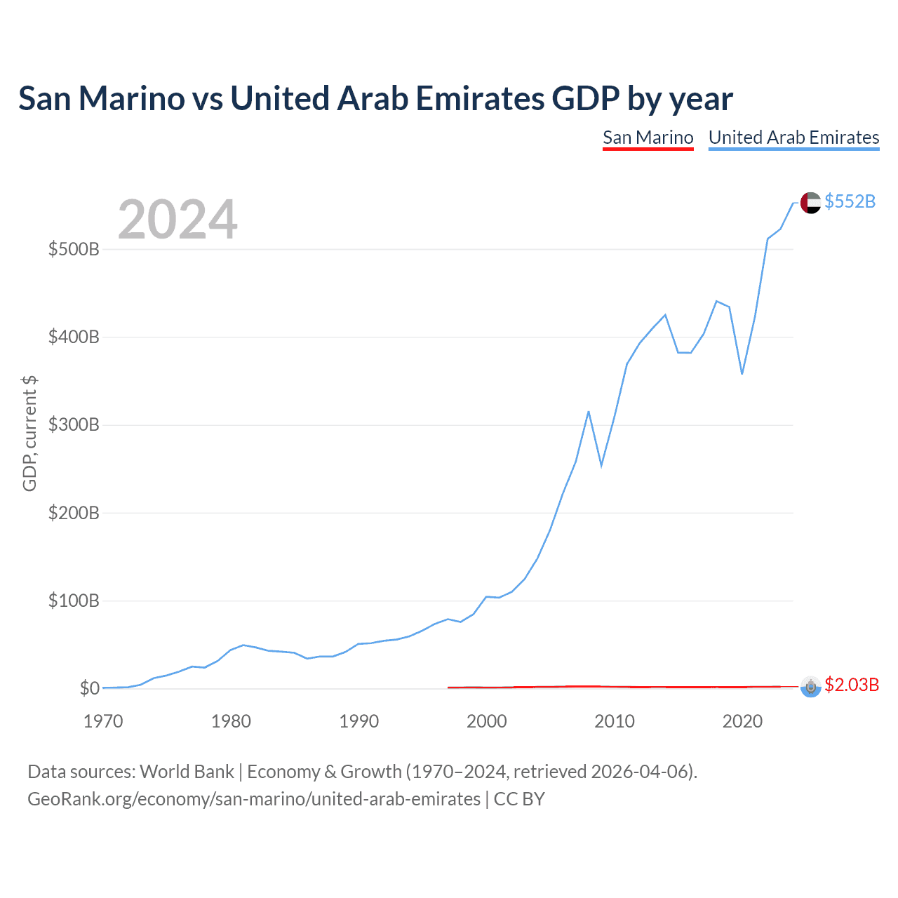 San Marino has a GDP of $2.03B compared to $552B for the United Arab Emirates, ranking 180/197 and 27/197 by economy size, respectively.
