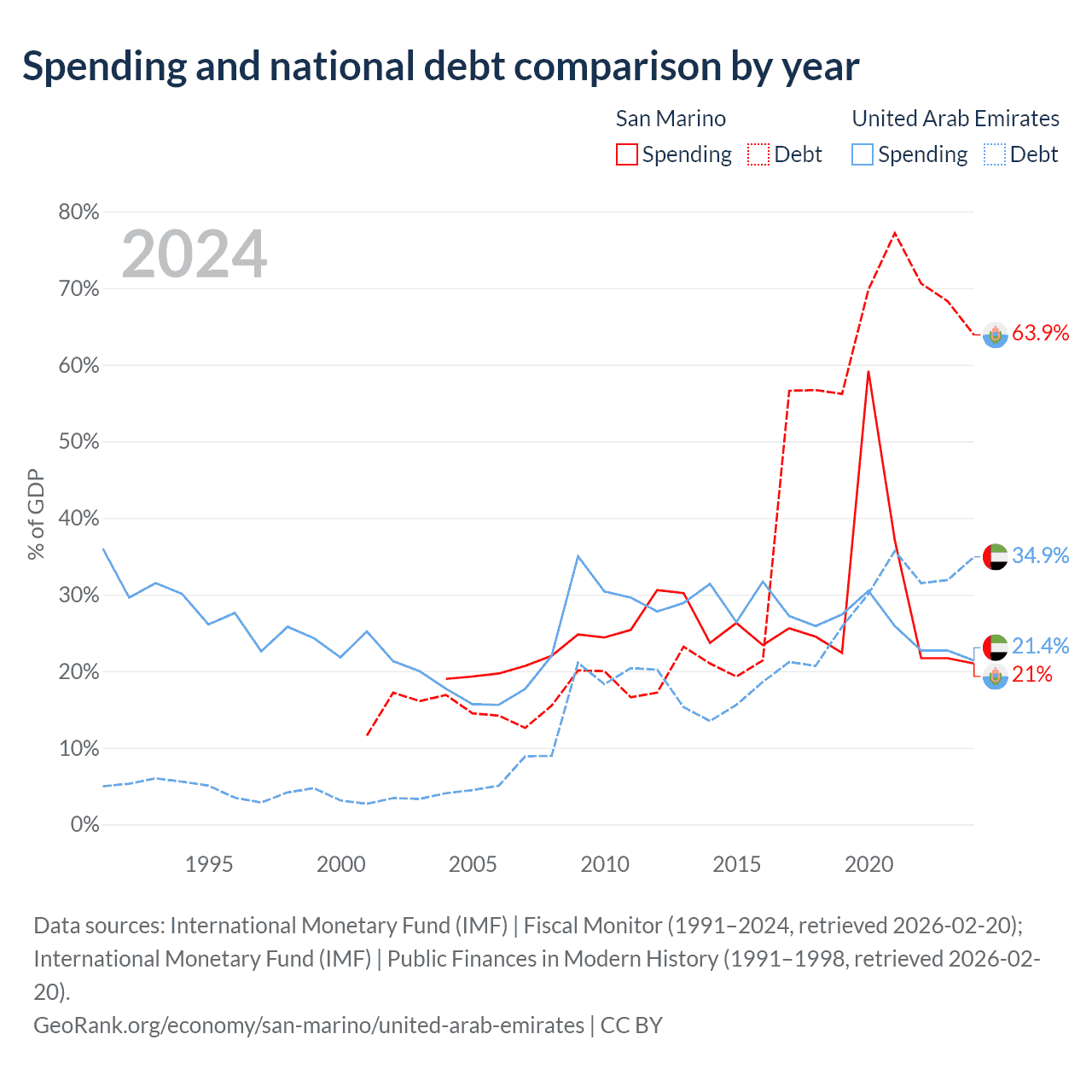 San Marino has $1.39B in government debt (63.9% of GDP), compared to $193B (34.9% of GDP) in the United Arab Emirates.