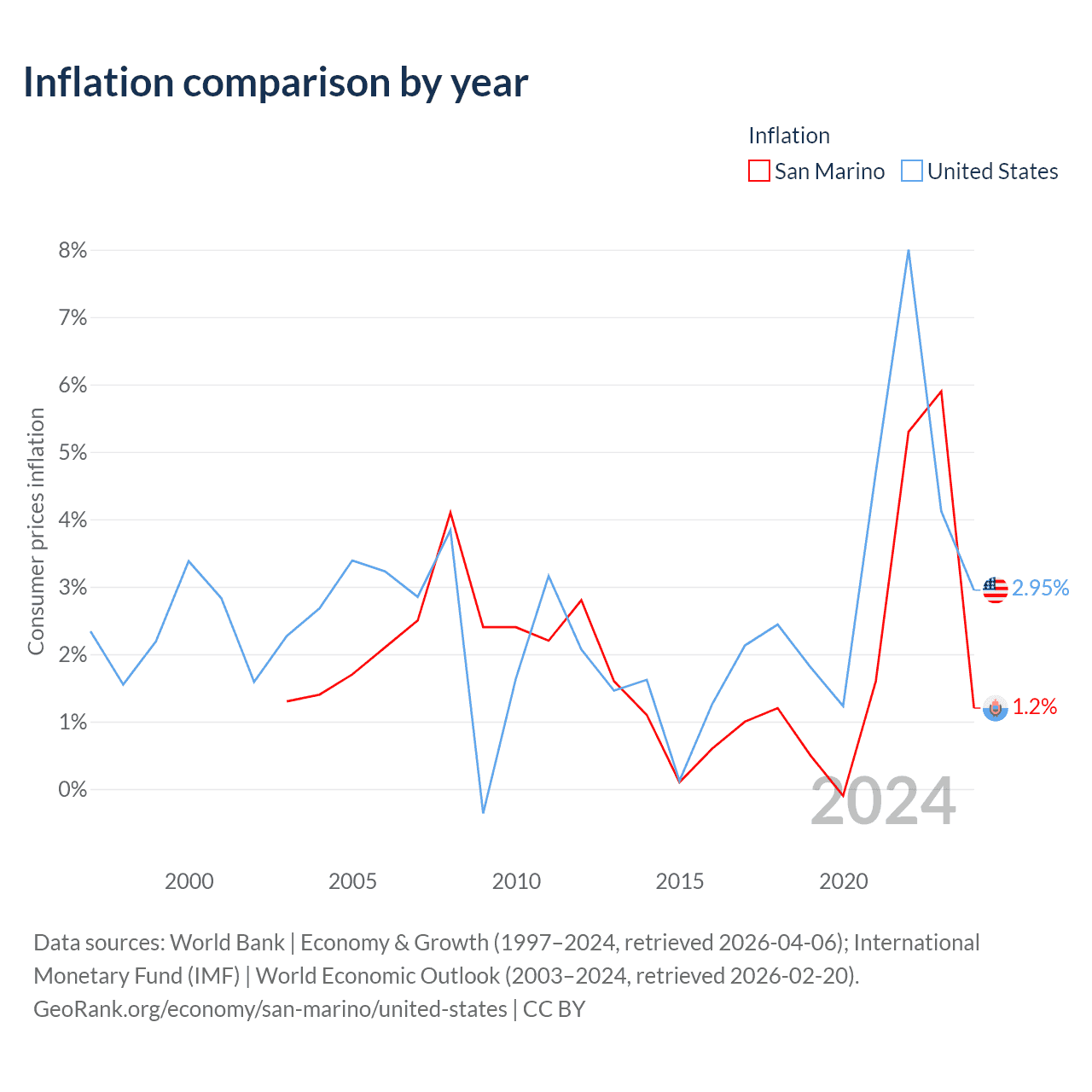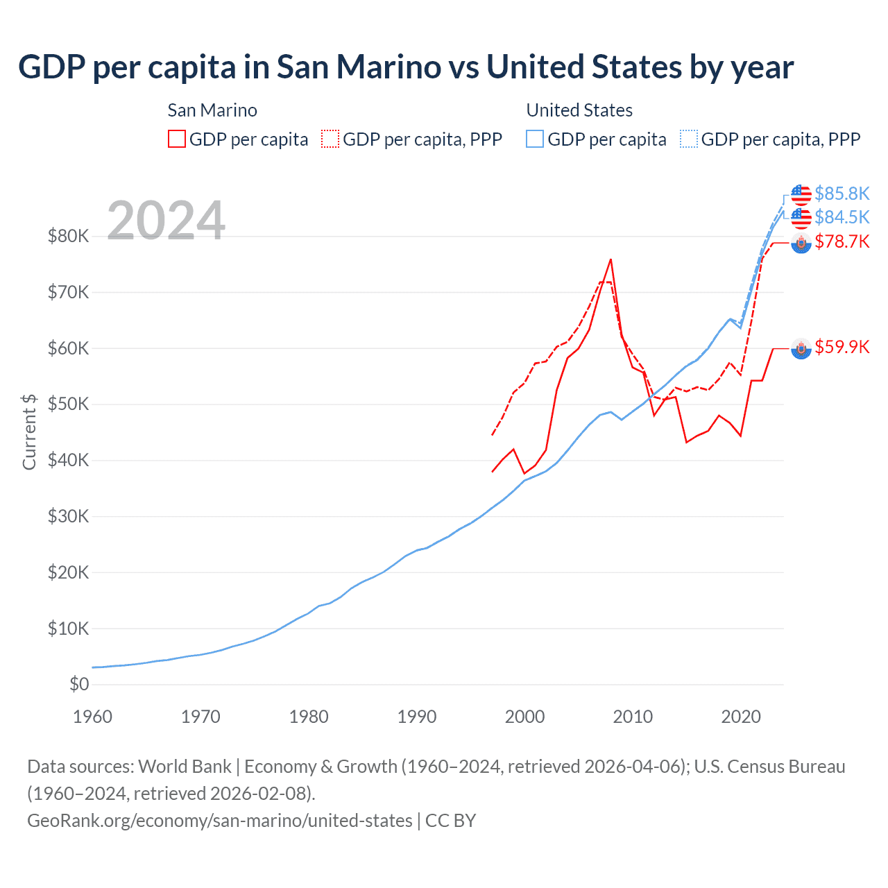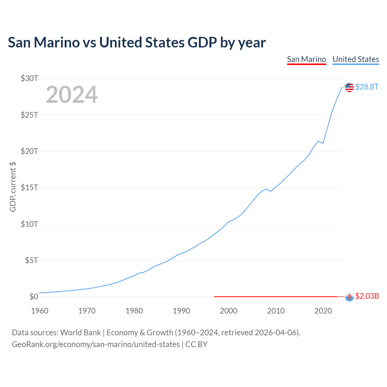 San Marino has a GDP of $2.03B compared to $28.8T for the United States, ranking 180/197 and 1/197 by economy size, respectively.