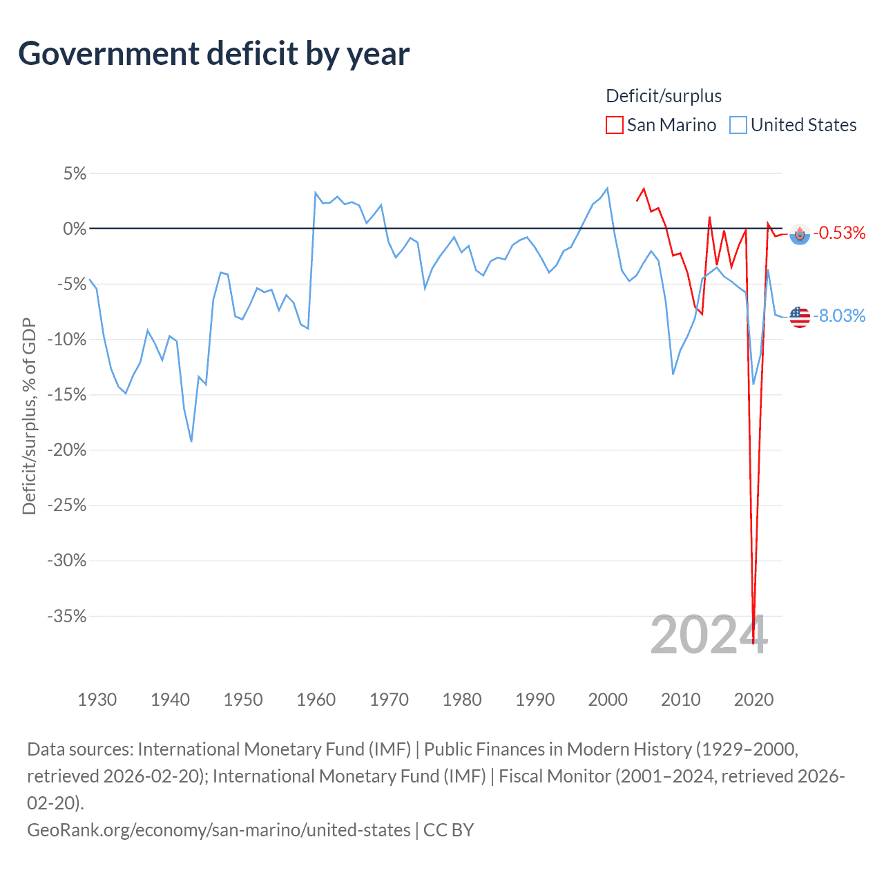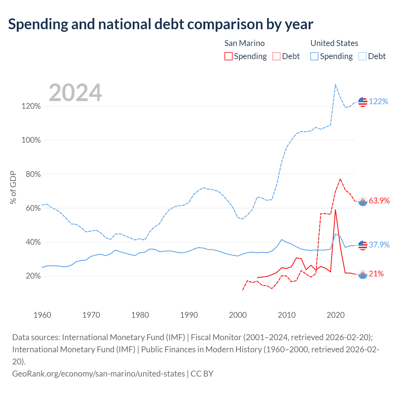 San Marino has $1.39B in government debt (63.9% of GDP), compared to $35.2T (122.3% of GDP) in the United States.