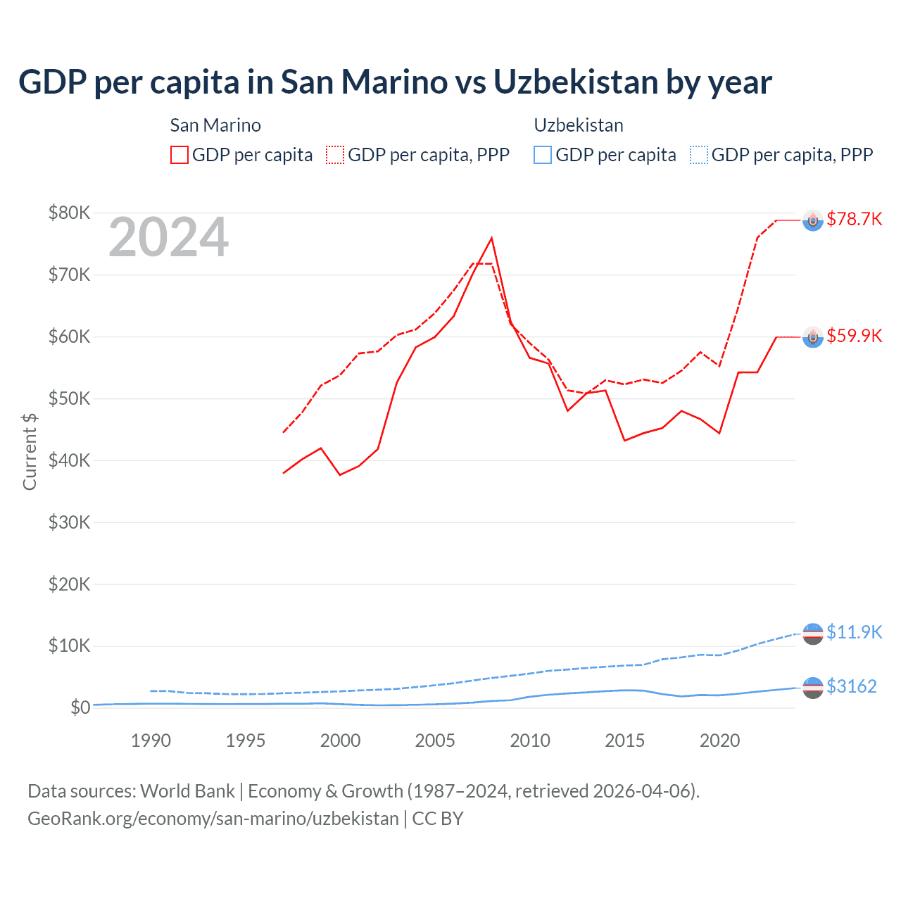 GDP per capita in San Marino vs Uzbekistan by year